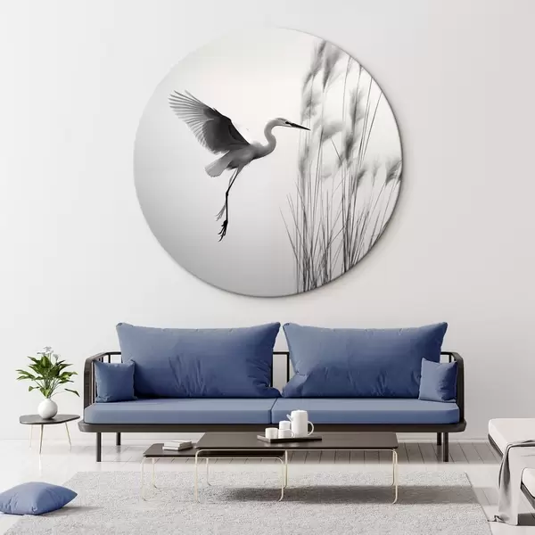 Picturi rotunde O stârcă albă cu aripile întinse, zburând lângă stufărișuri înalte, compoziție minimalistă în alb și negru r46693