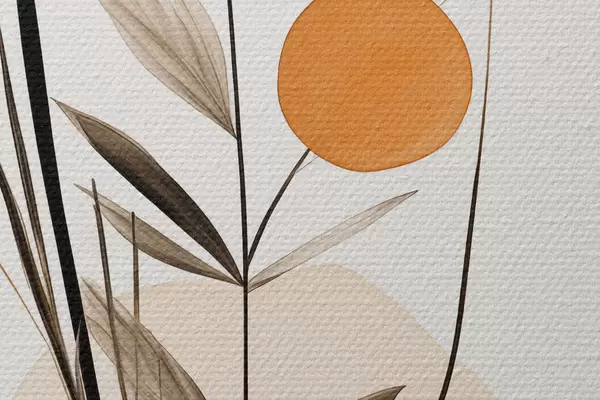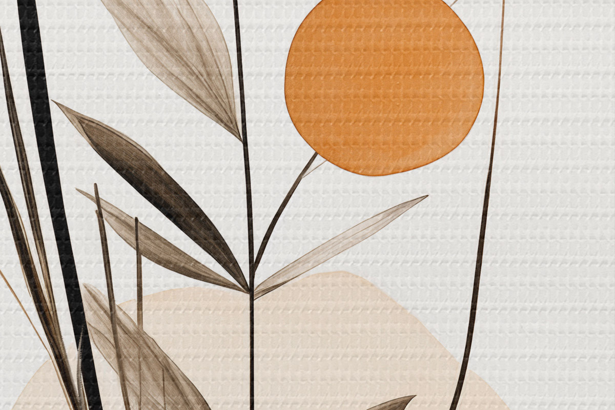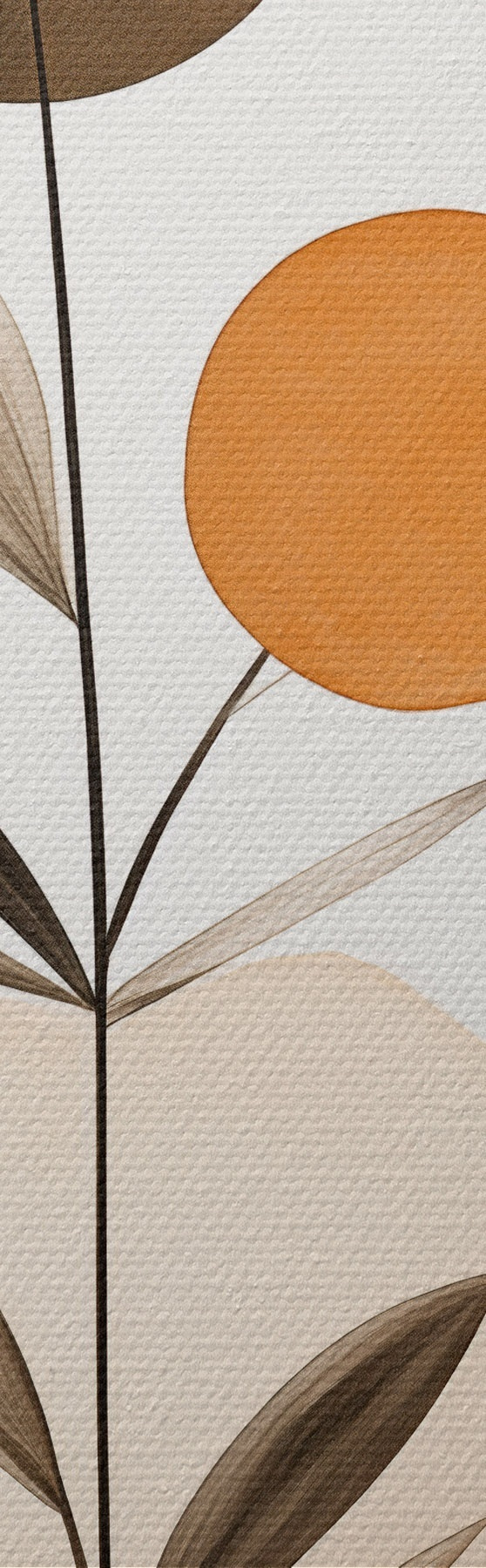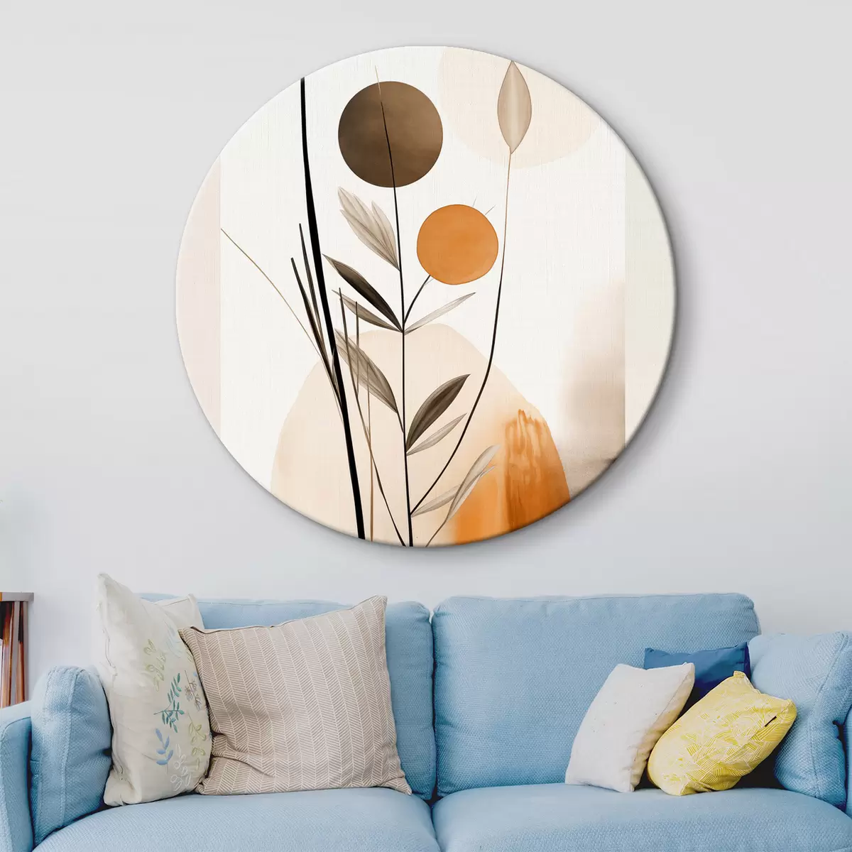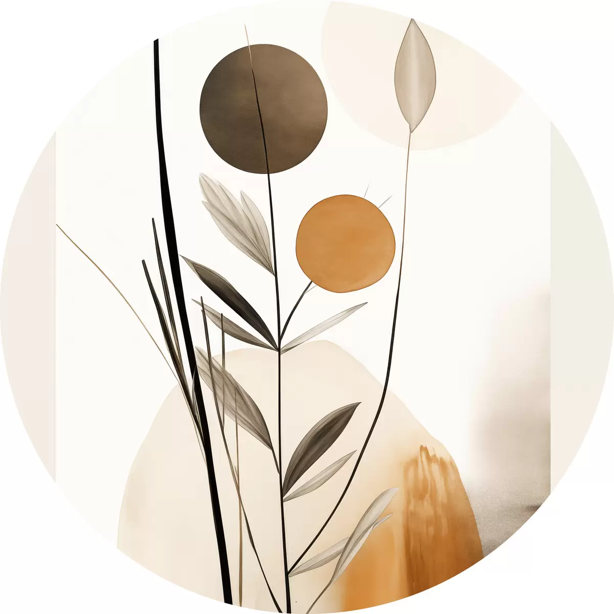 Picturi rotunde Imitare de pictură abstractă cu cercuri portocalii și gri, frunze și ramuri, stil modern, efect de acuarelă Nr r46698