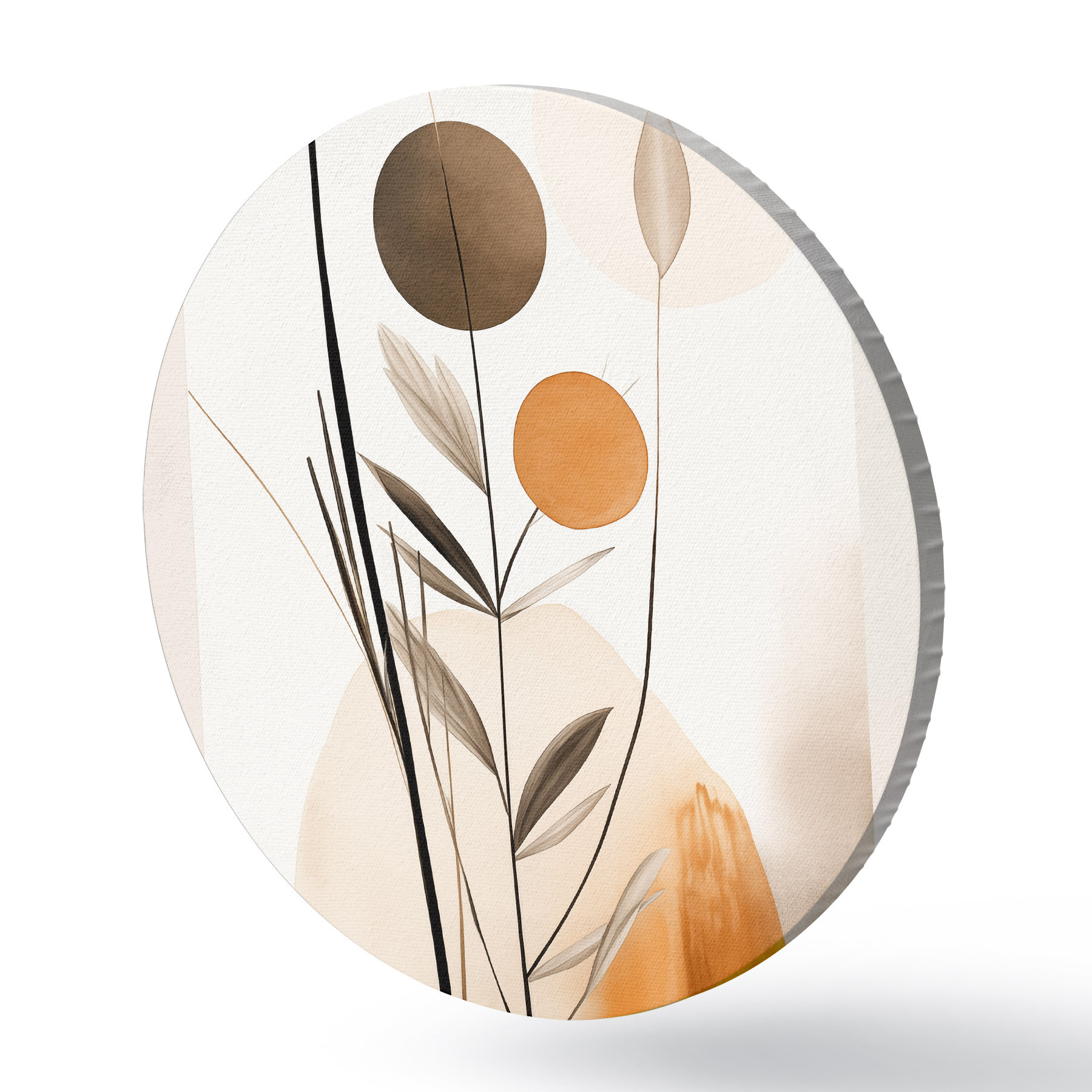 Picturi rotunde Imitare de pictură abstractă cu cercuri portocalii și gri, frunze și ramuri, stil modern, efect de acuarelă r46698