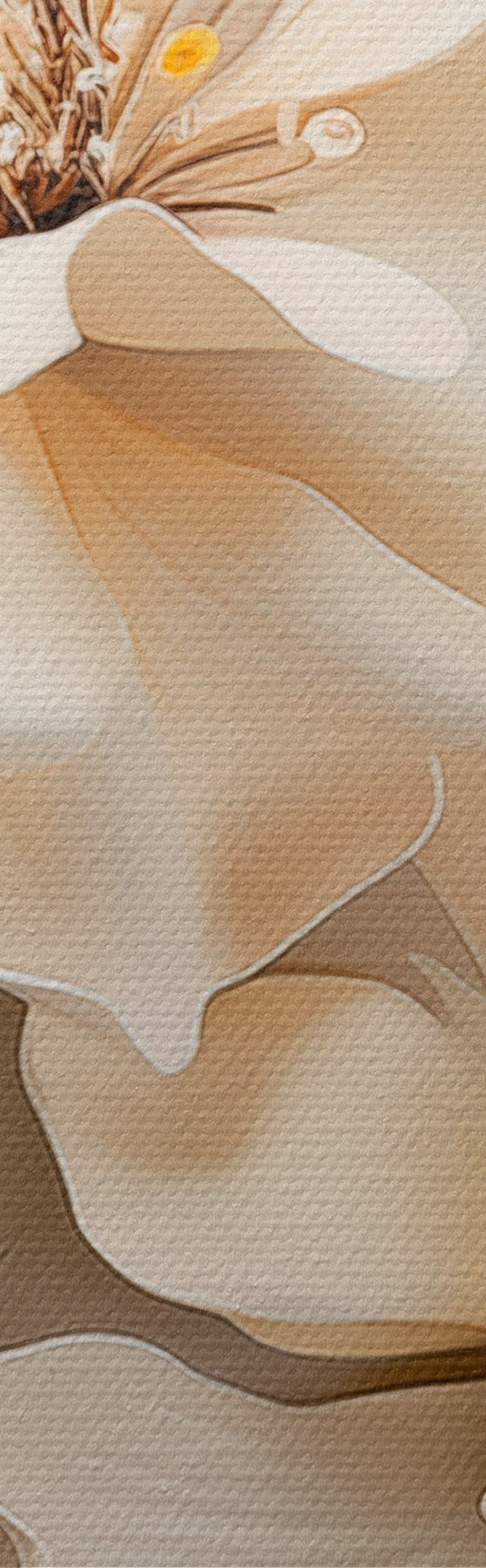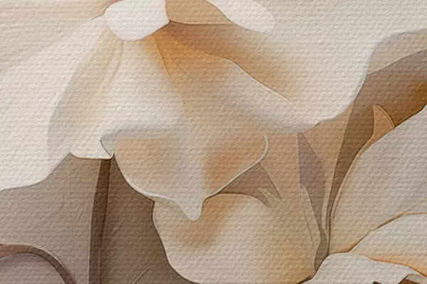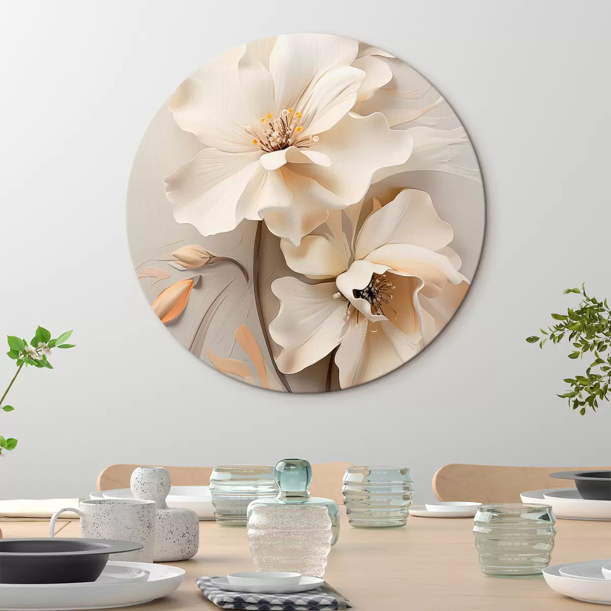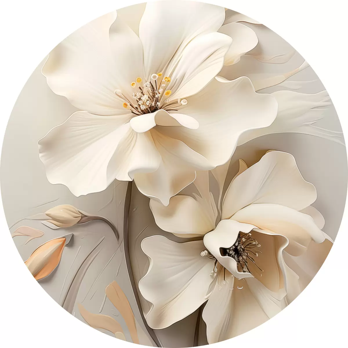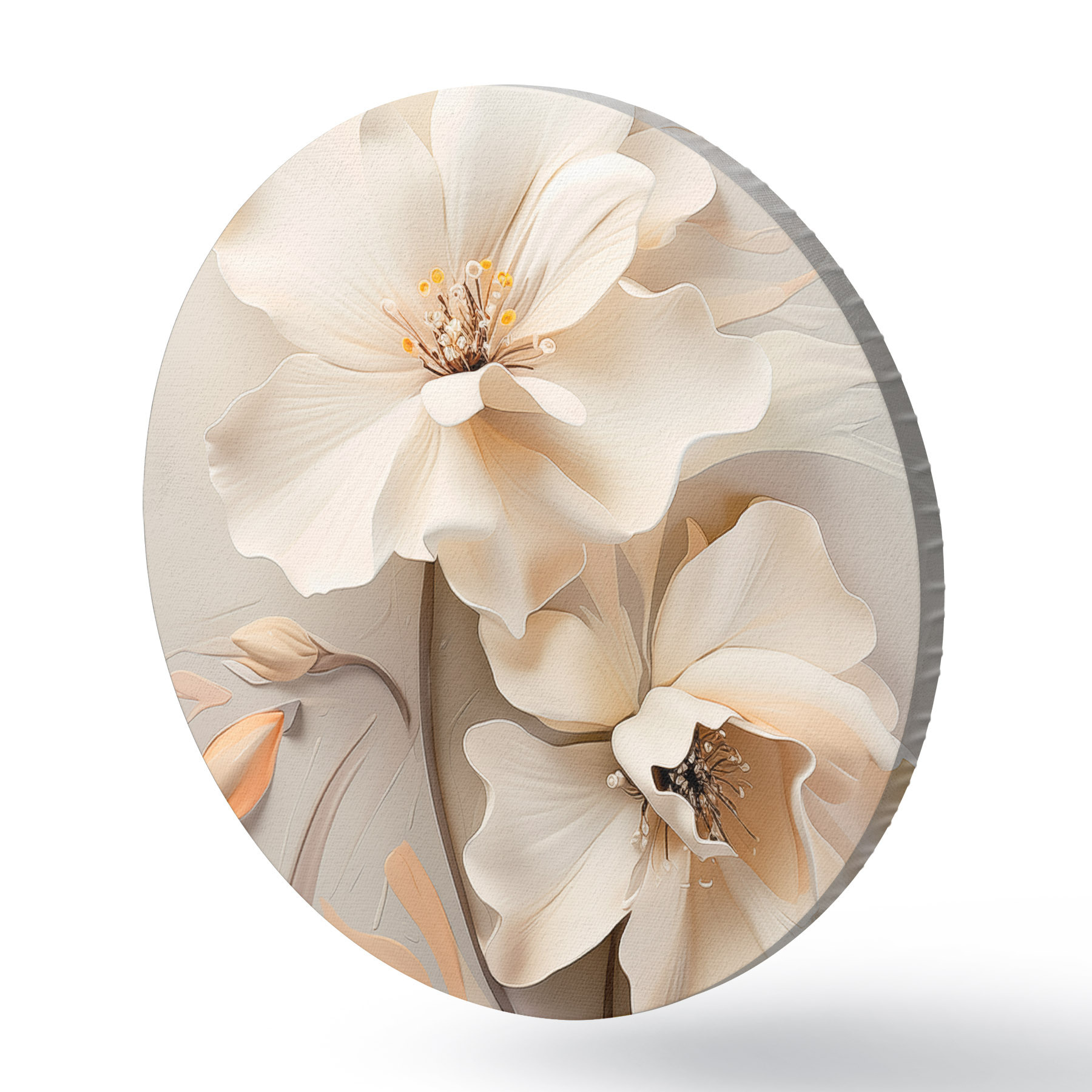 Picturi rotunde Flori albe, petale cu umbre delicate, fundal bej deschis, compoziție elegantă, stil minimalist Nr r46700