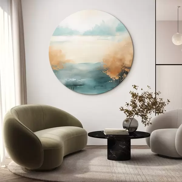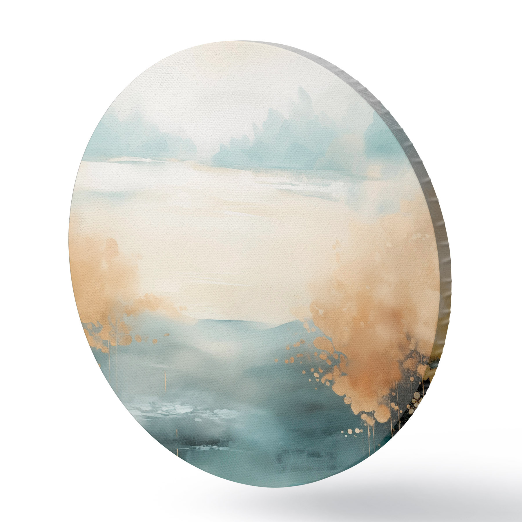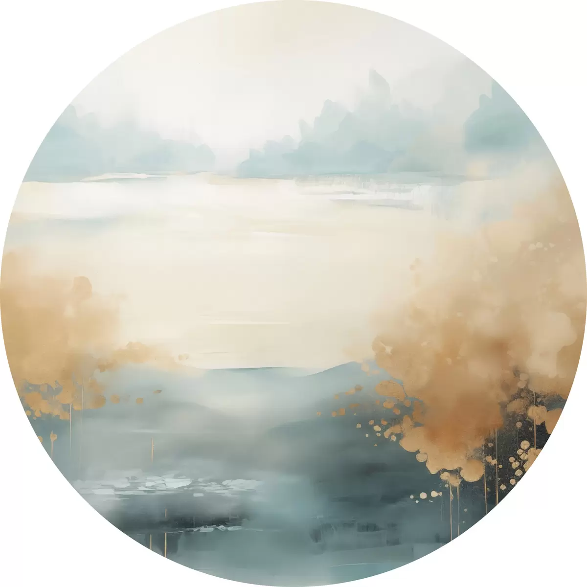 Picturi rotunde Peisaj abstract cu munți și lac în nuanțe de verde-albastru și galben texturat, pensule moi, operă de artă minimalistă Nr r46704