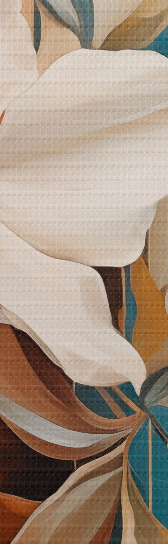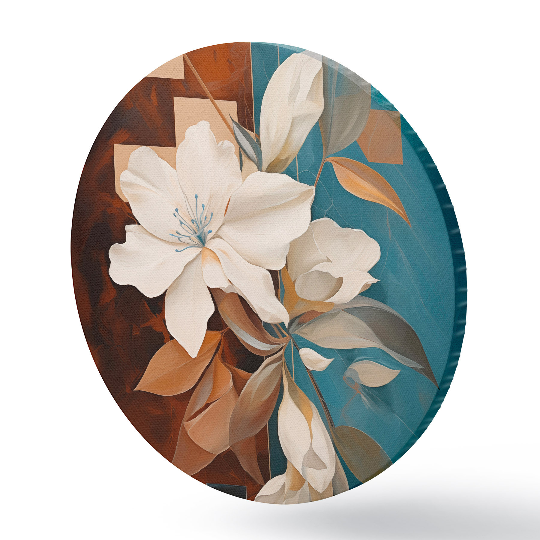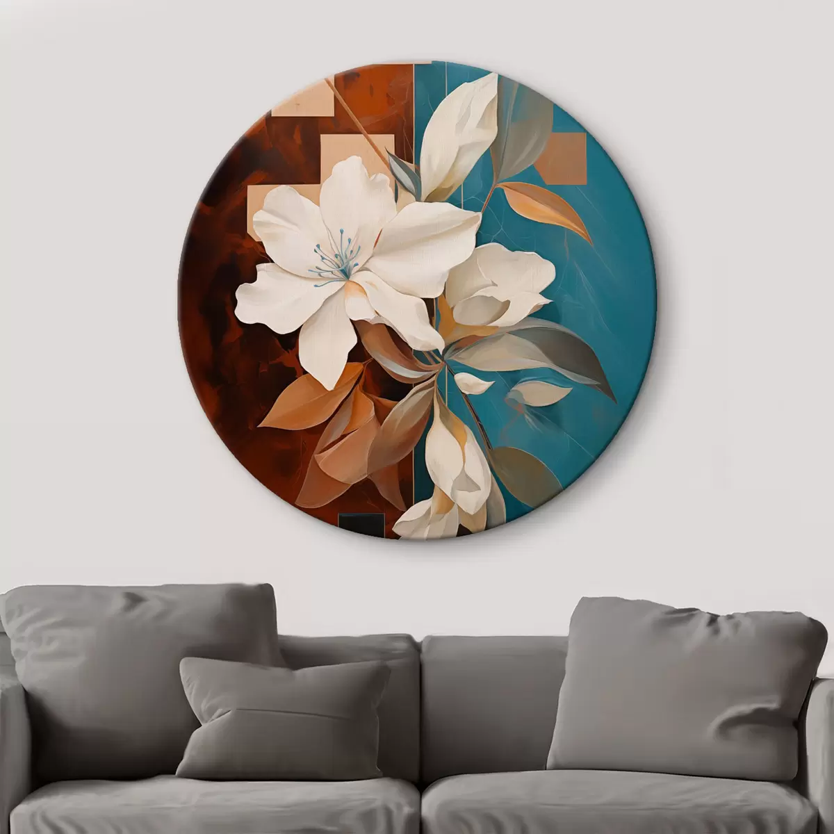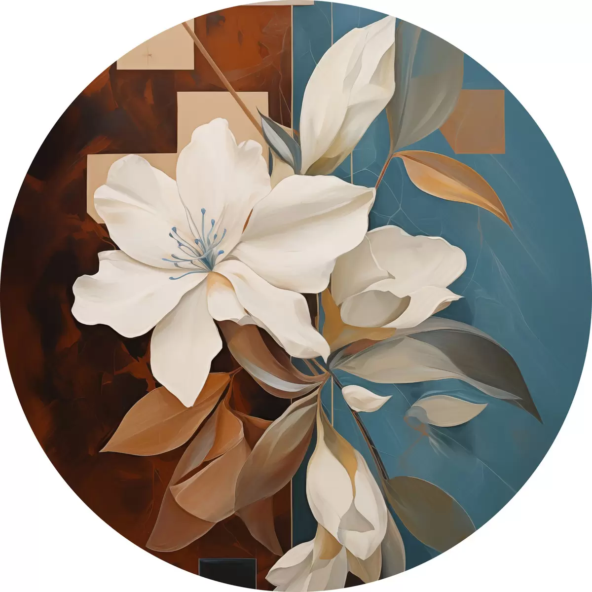 Picturi rotunde Flori și frunze albe abstracte pe un fundal maro și albastru cu forme abstracte, într-un stil minimalist r46709