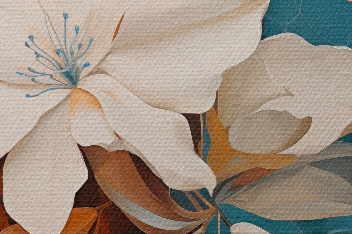 Picturi rotunde Flori și frunze albe abstracte pe un fundal maro și albastru cu forme abstracte, într-un stil minimalist Nr r46709