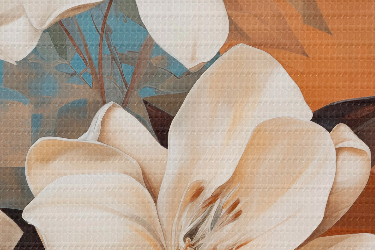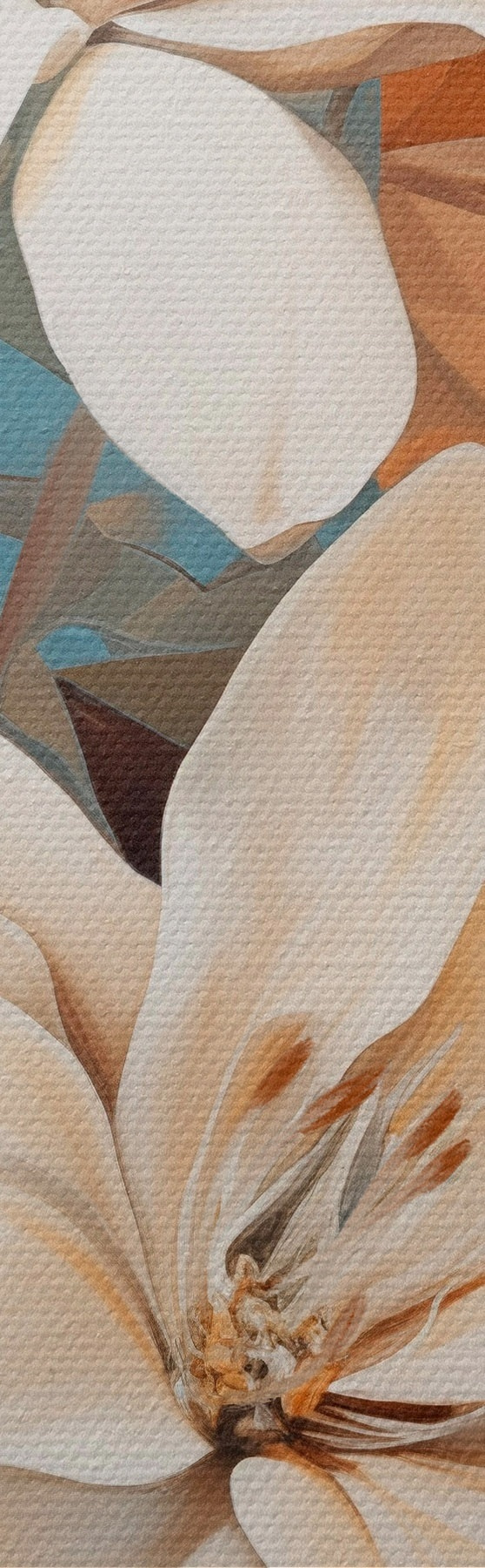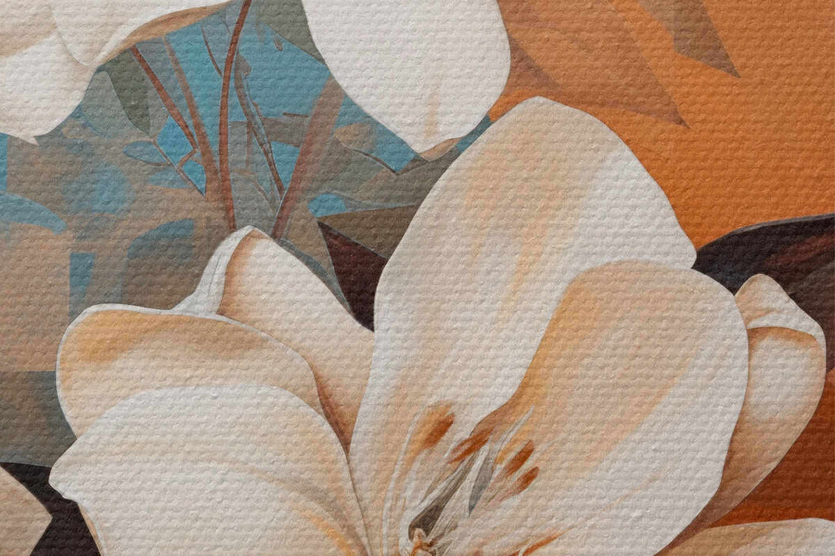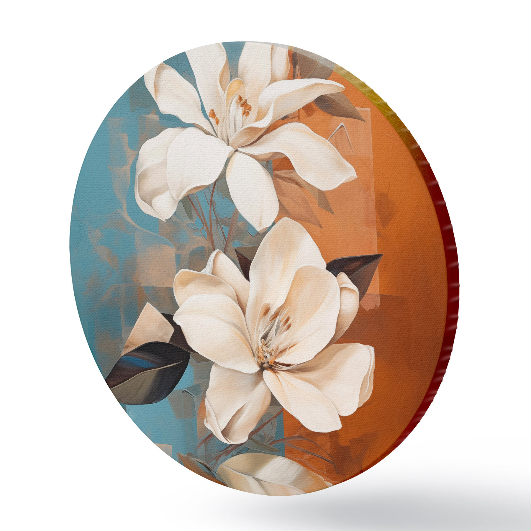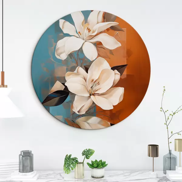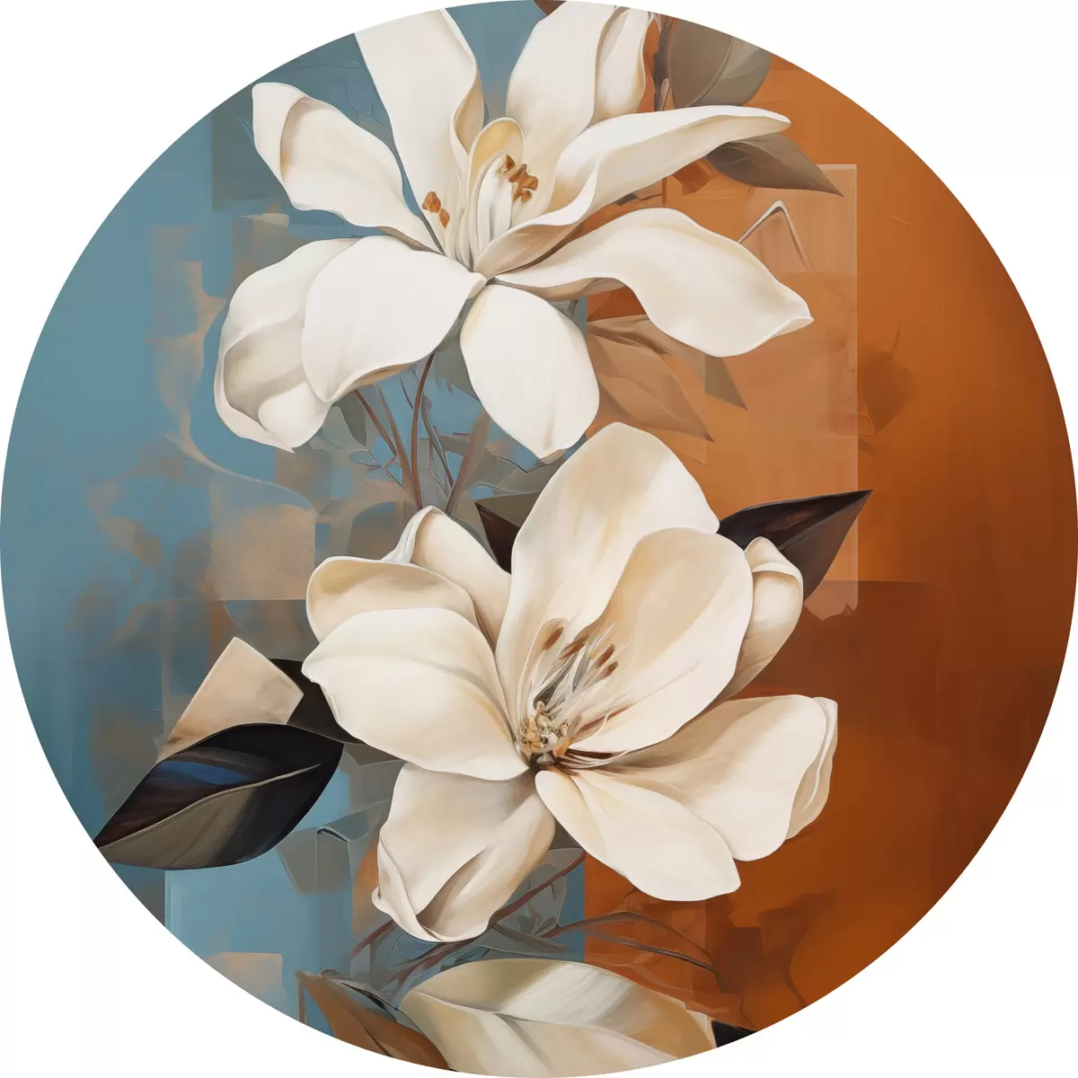 Picturi rotunde Flori și frunze albe abstracte pe un fundal maro și albastru cu forme abstracte, într-un stil minimalist Nr r46710
