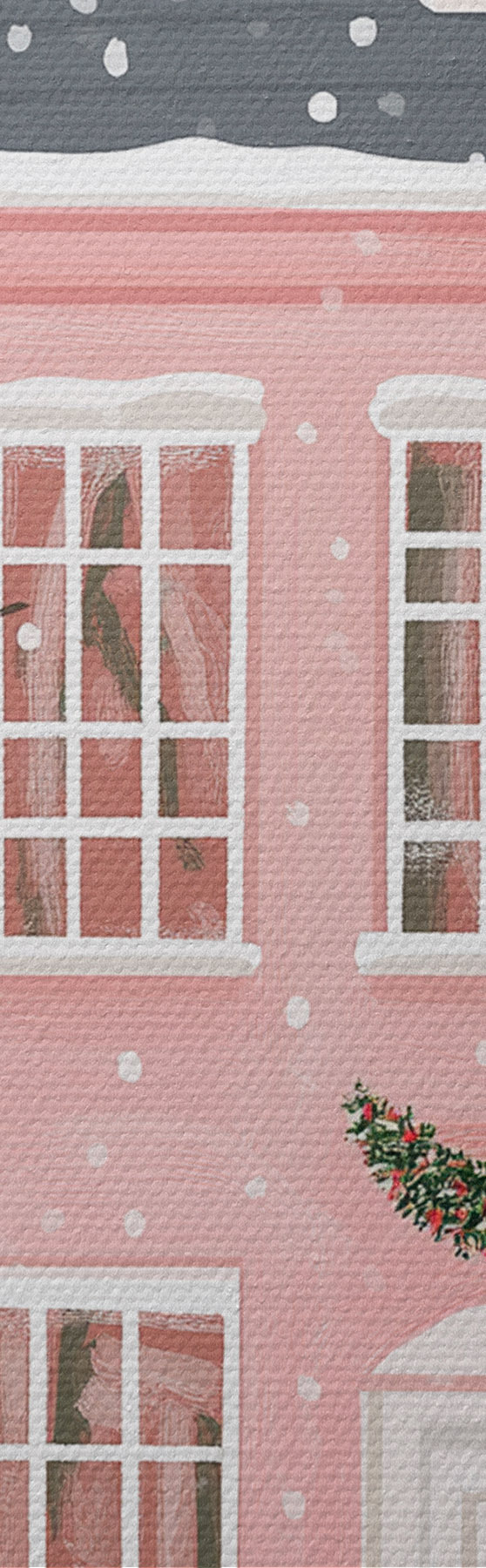 Pictură pe pânză Frumos oraș de iarnă cu case roz, copaci de pin, fulgi de zăpadă Nr m00410