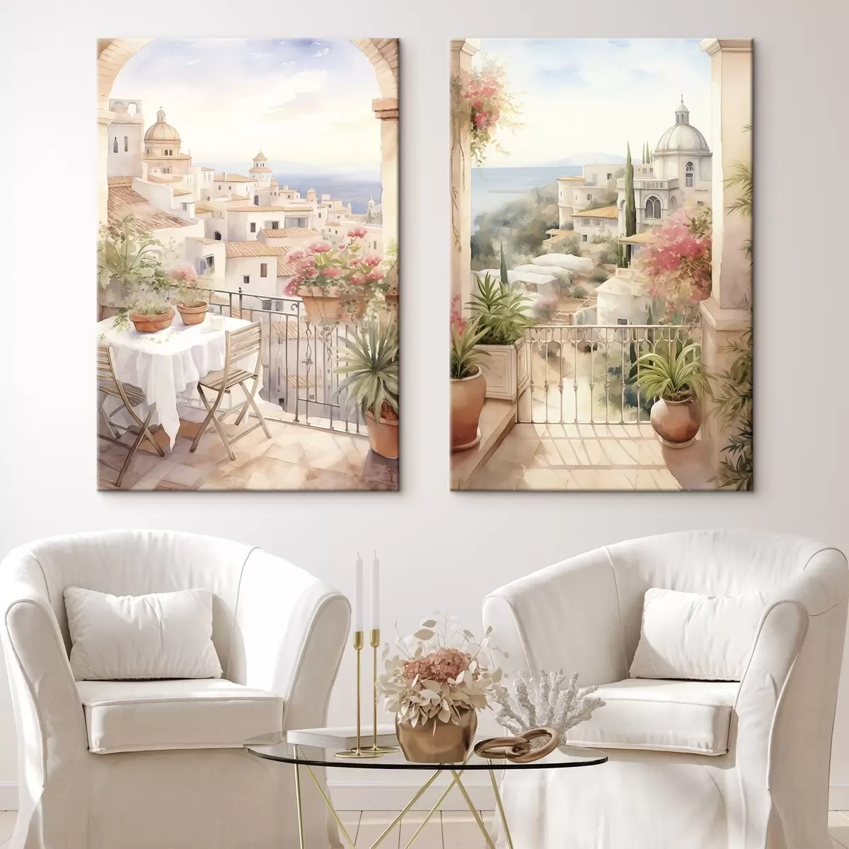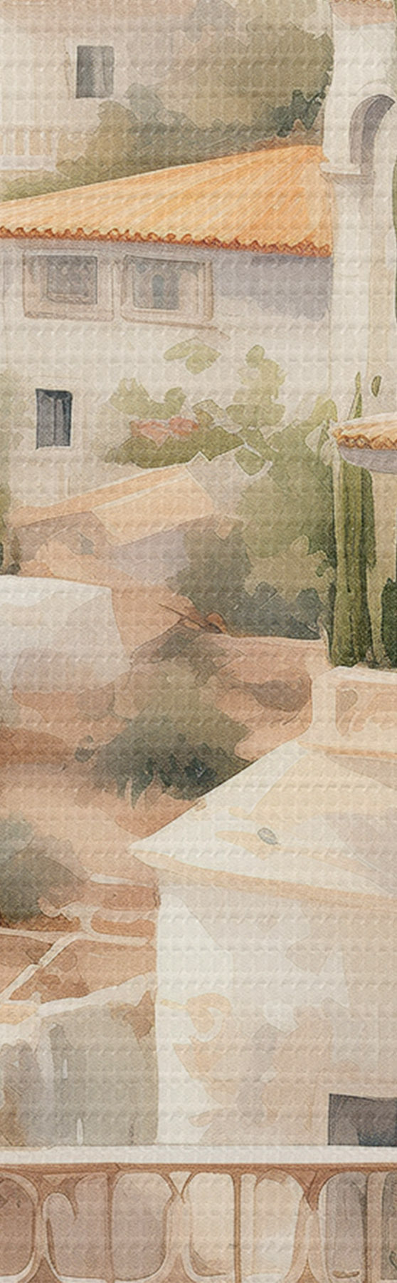 Pictură pe pânză Apus de soare pe balcon, arhitectura, flori înflorite, stil acuarelă, mediteranean Nr m00420