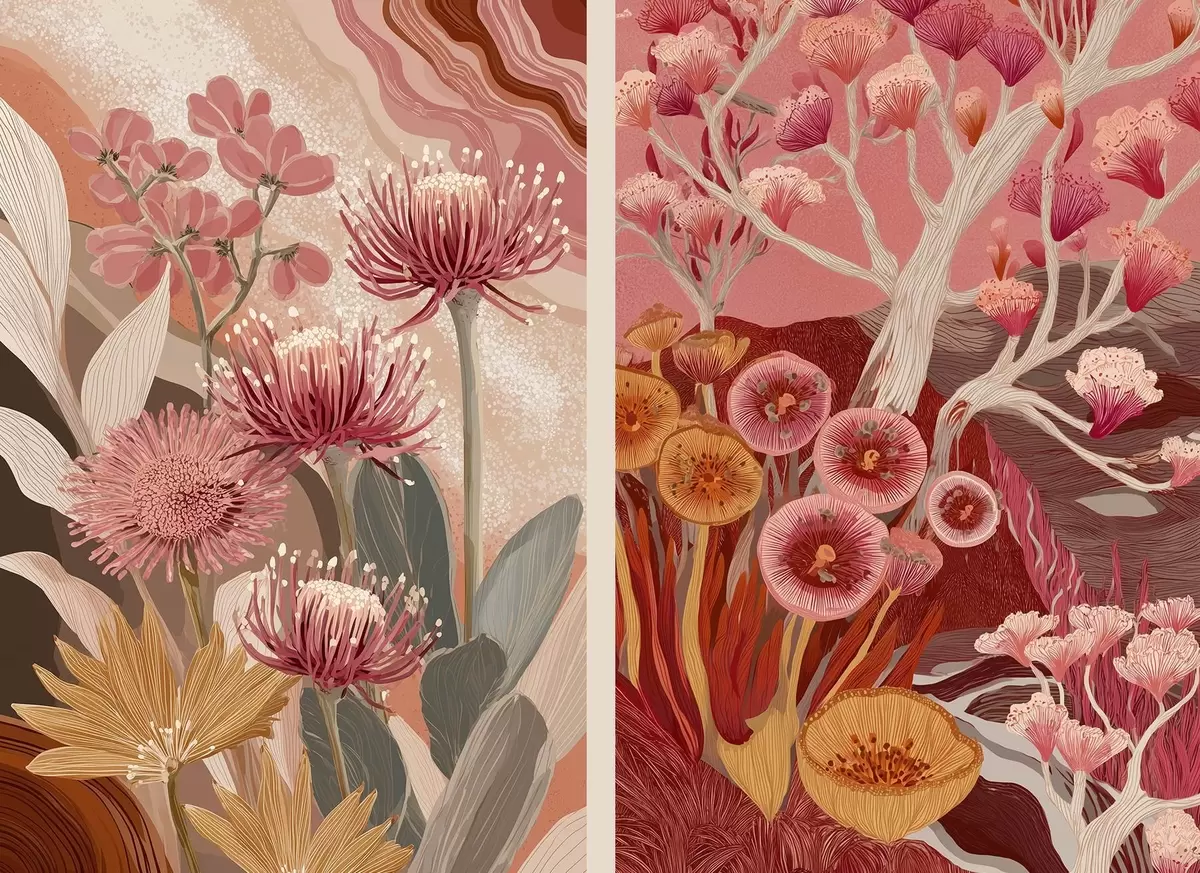 Pictură pe pânză Boho stil flori, desen detaliat, culori burgundy Nr m00476