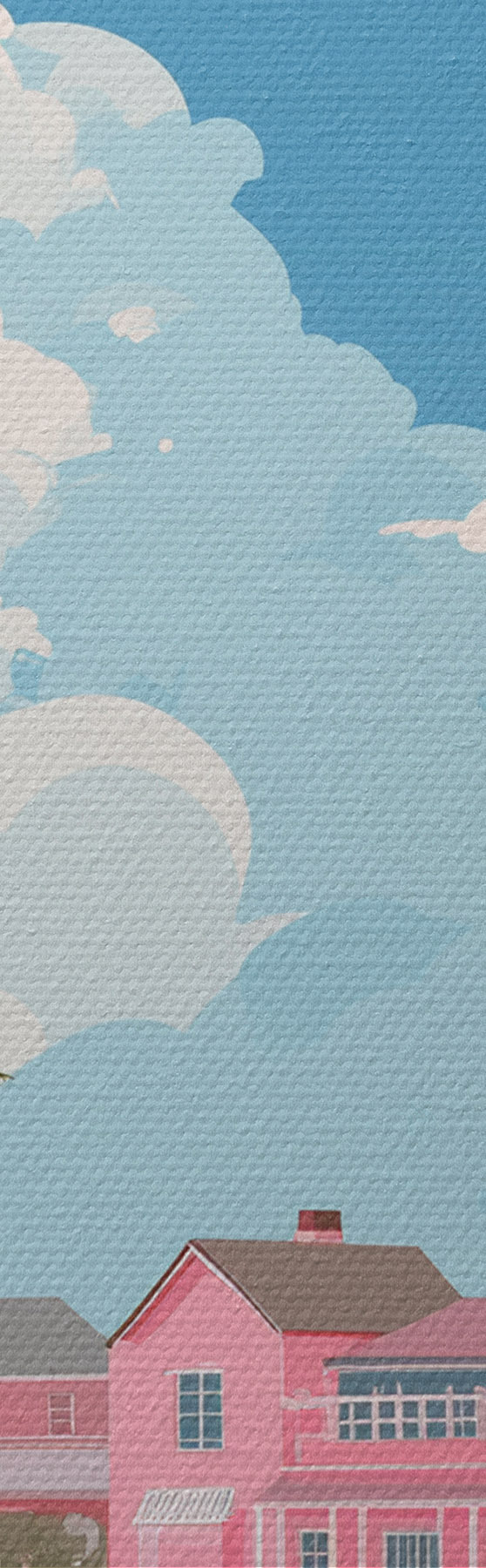 Pictură pe pânză Plajă de vară roz cu soare, barcă cu pânze și case Nr m00479