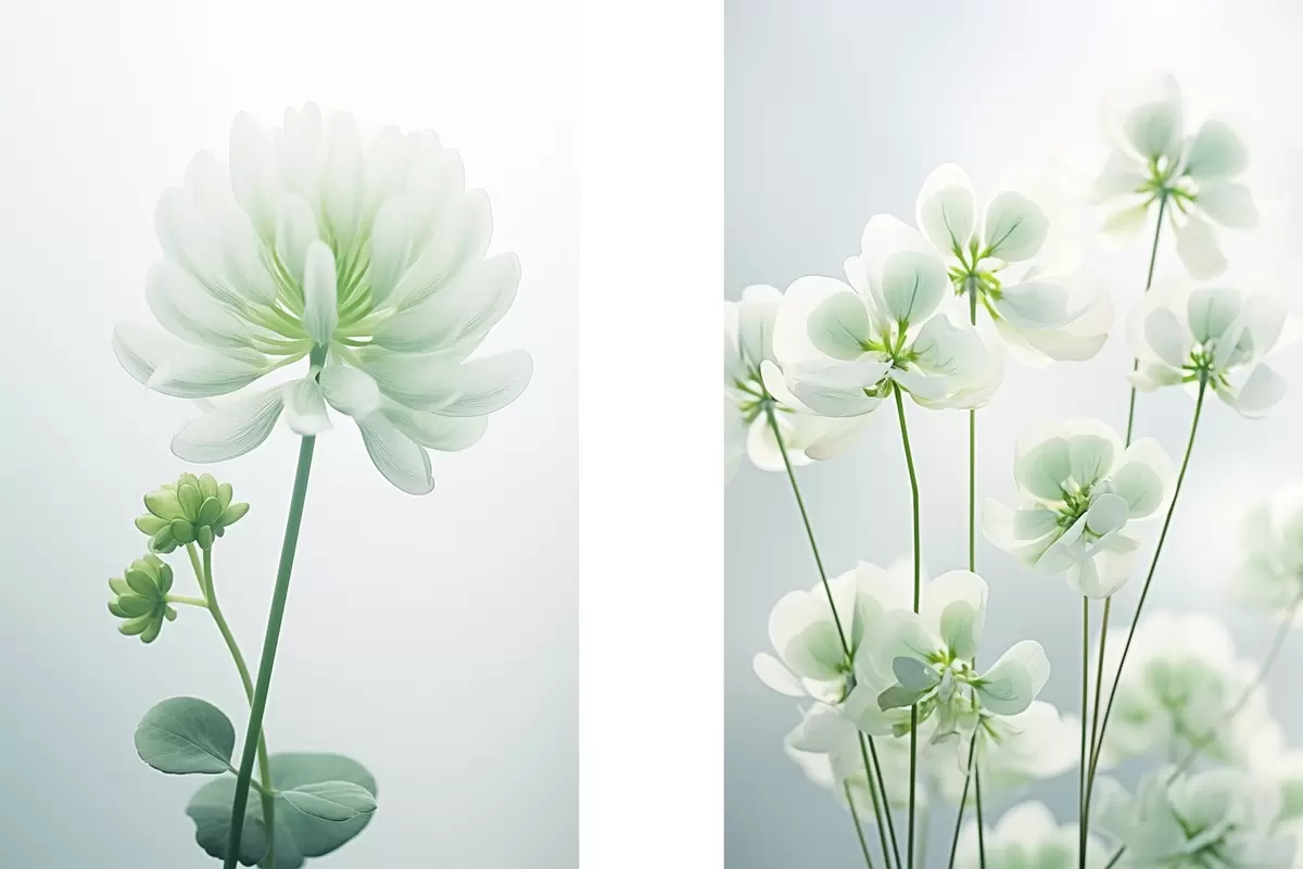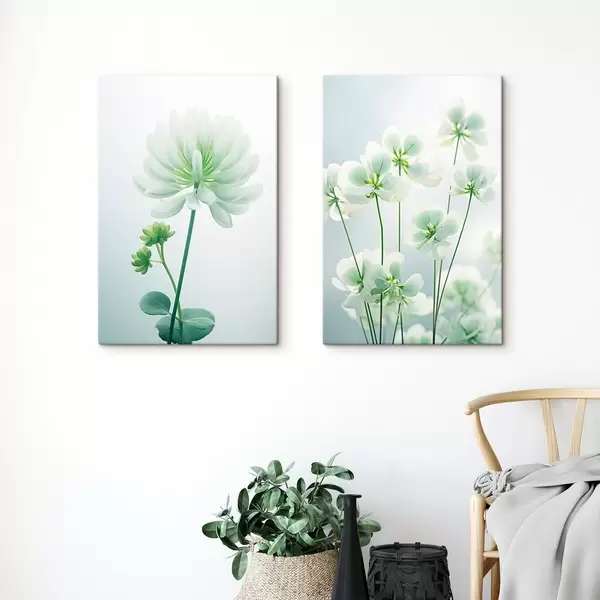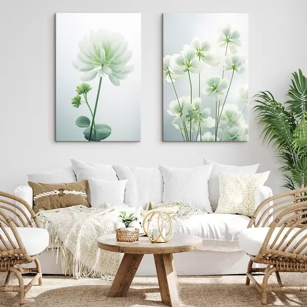 Pictură pe pânză Flori albe de trifoi cu tulpină și frunze verzi, iluminare moale, fundal curat, compoziție minimalistă, botanică Nr m00520