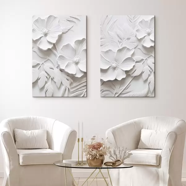 Tablouri Decorative minimaliste flori albe cu frunze, imitație de relief, fundal alb m00524