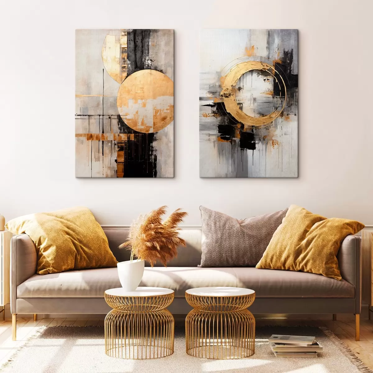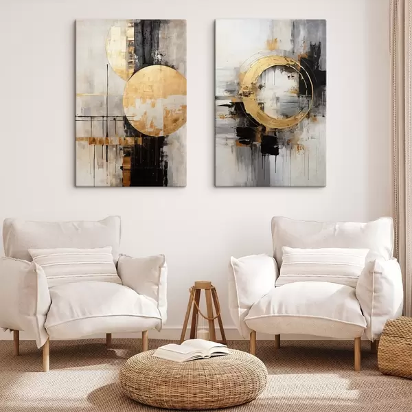 Pictură pe pânză Tablou abstract cu cercuri, linii negre și galbene și un fundal cu tonuri de gri și alb Nr m00527