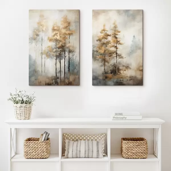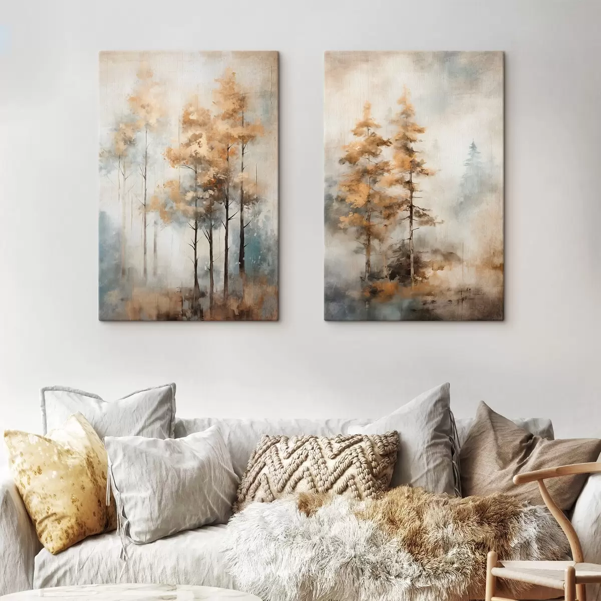 Pictură pe pânză Copaci înalți texturați cu frunze galbene într-o pădure, fundalul este un amestec de tonuri moi de albastru și maro Nr m00528