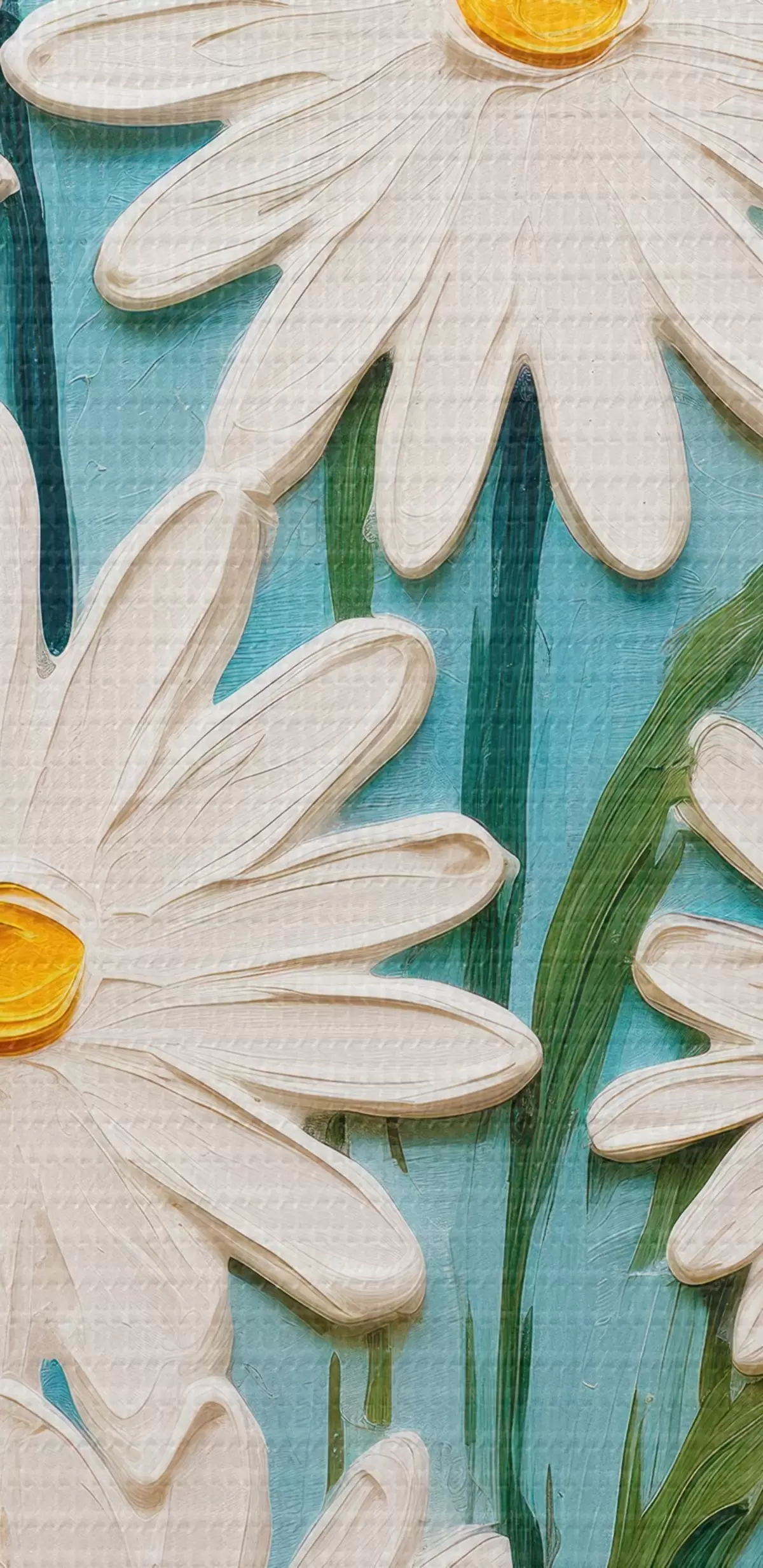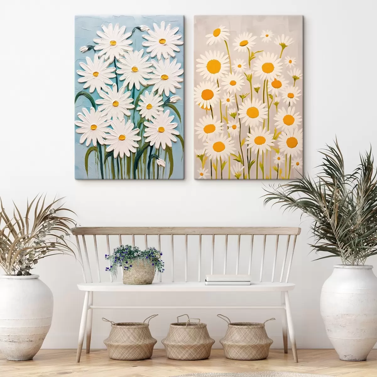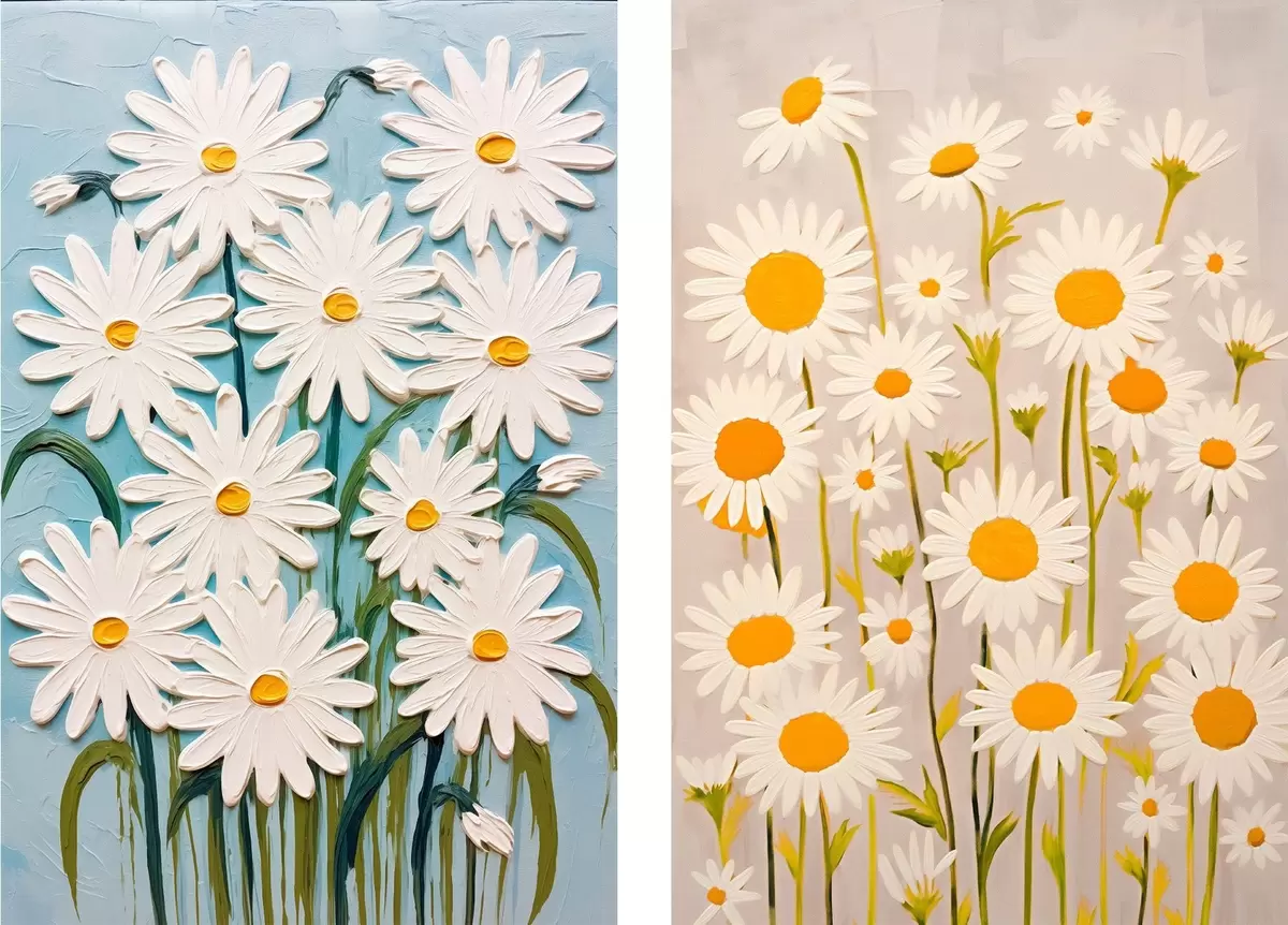 Pictură pe pânză Prospețimea primăverii: diptic cu margarete voluminoase în stil impasto Nr m00633