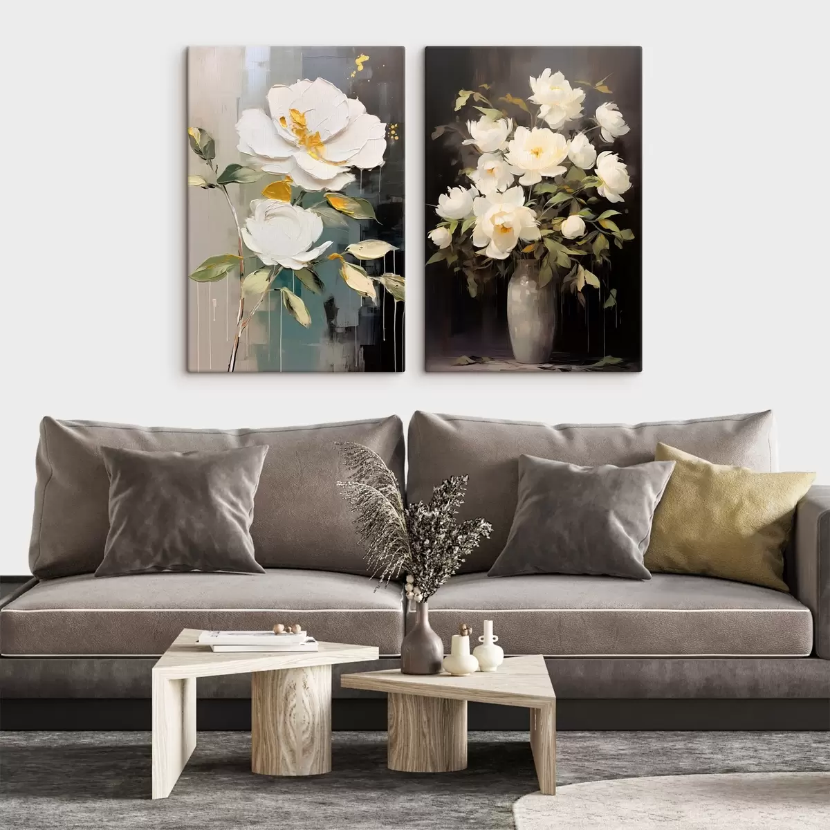Pictură pe pânză Bujorii albe pe un fundal întunecat: compoziție decorativă Nr m00634