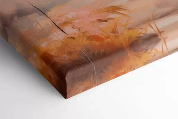 Pictură pe pânză Un peisaj cu tufișuri și copaci în nuanțe de roz , portocaliu , și maro , cu munți în fundal Nr m00646