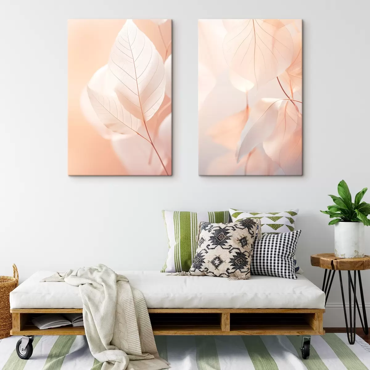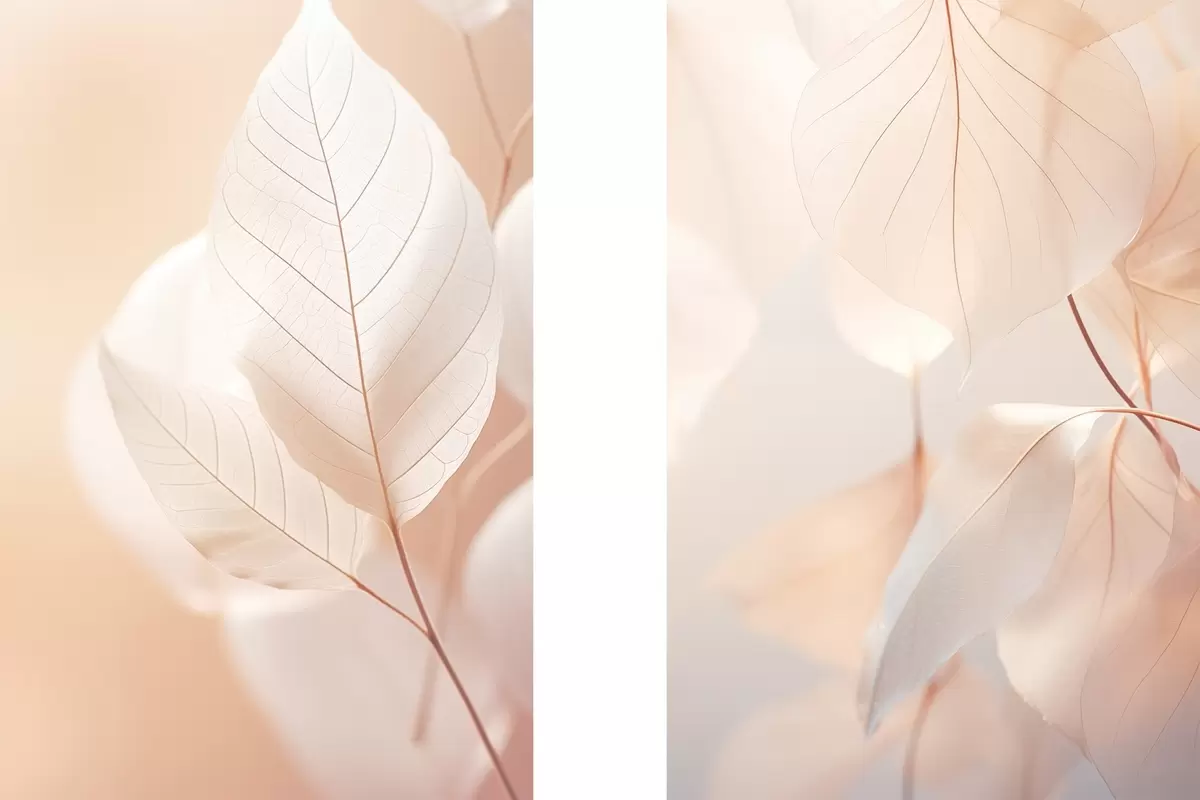 Pictură pe pânză Close-up de frunze translucide cu vene delicate, paleta de culori piersică moale și alb, fundal neclar Nr m00647