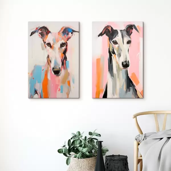 Pictură pe pânză Un câine greyhound, pictat cu culori vibrante precum portocaliu, roz și albastru, pe un fundal alb simplu Nr m00652