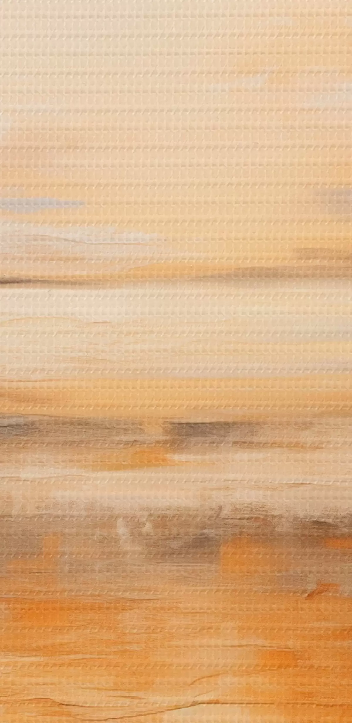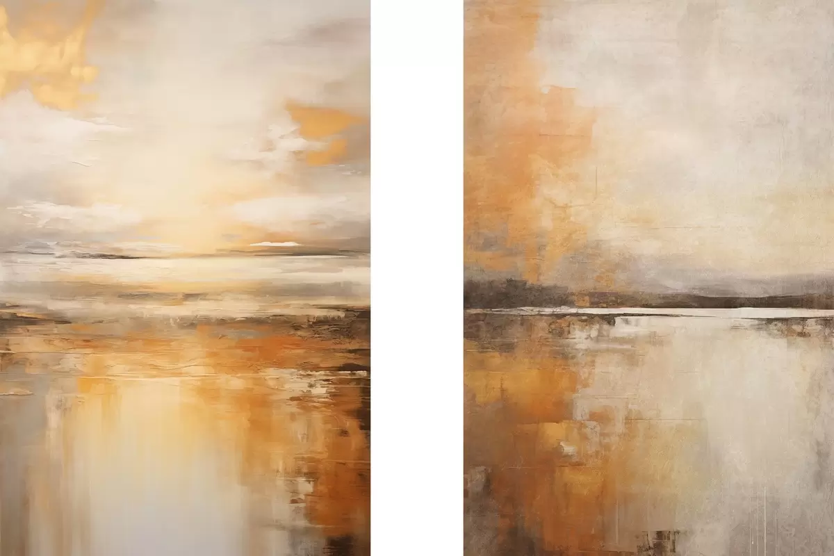 Pictură pe pânză O pictură abstractă a unui peisaj de plajă cu un ocean calm, nisip portocaliu și un cer noros cu soare Nr m00653