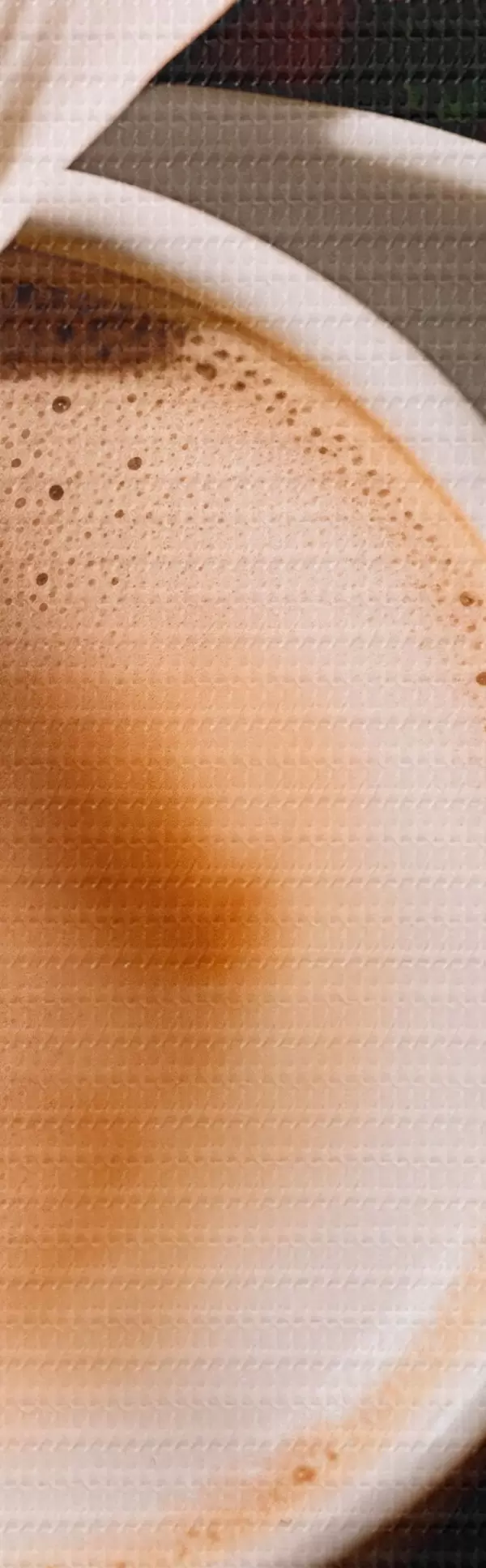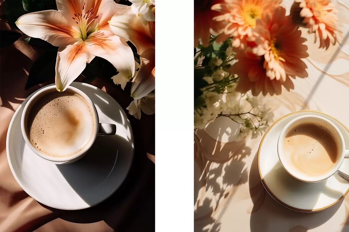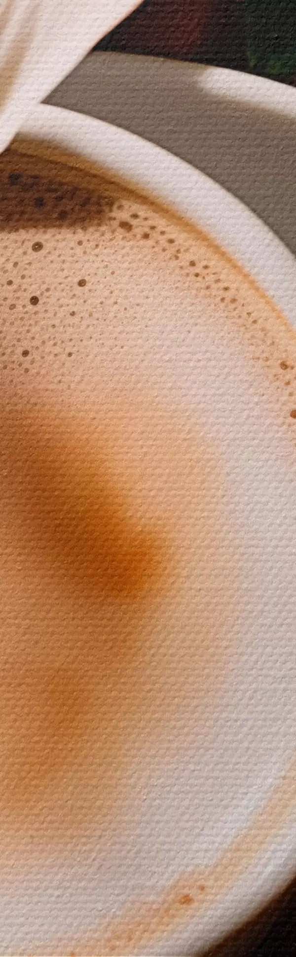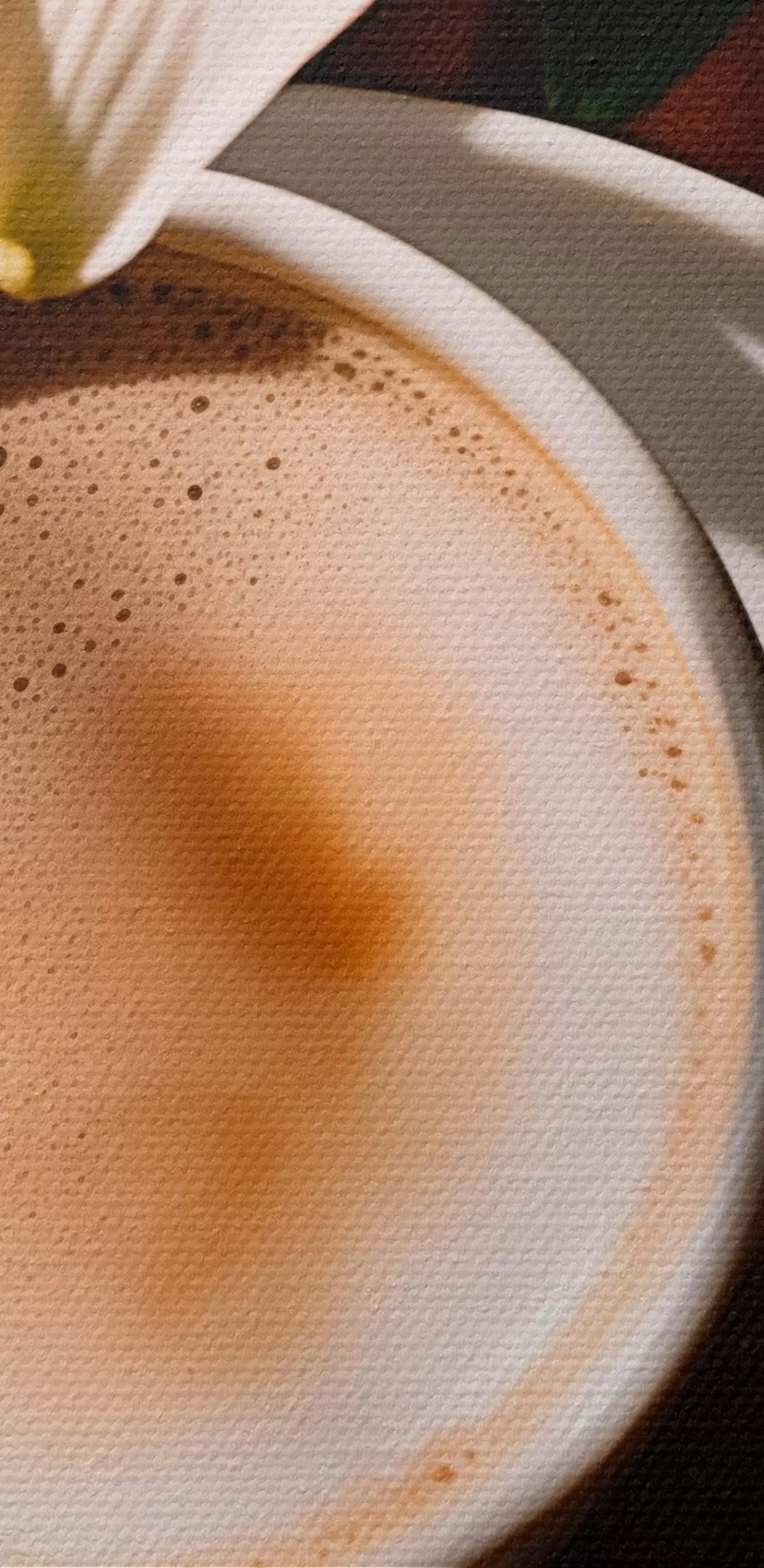 Pictură pe pânză O ceașcă de cafea cu spumă pe o farfurie albă, câteva flori în fundal, cu lumina soarelui Nr m00654