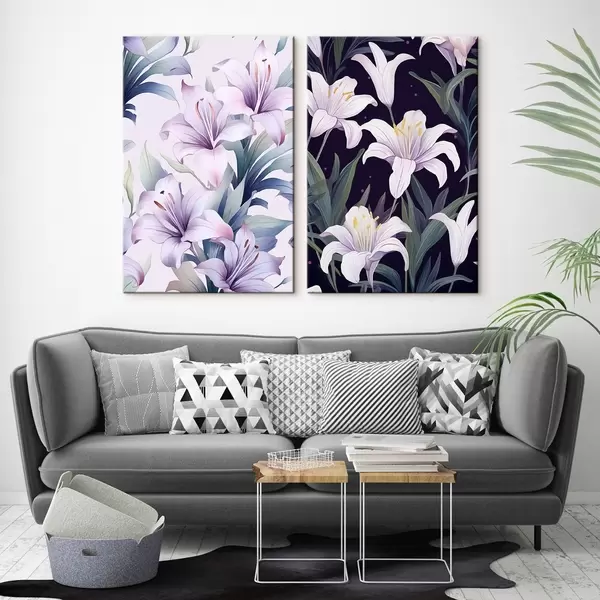Pictură pe pânză Crini roz delicat cu frunze verzi pe fundal deschis și închis Nr m00689