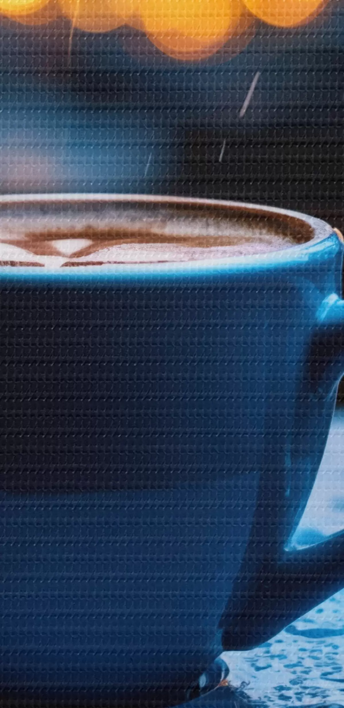 Pictură pe pânză Flori albastre cu picături de apă și o ceașcă de cafea în ploaie Nr m00694