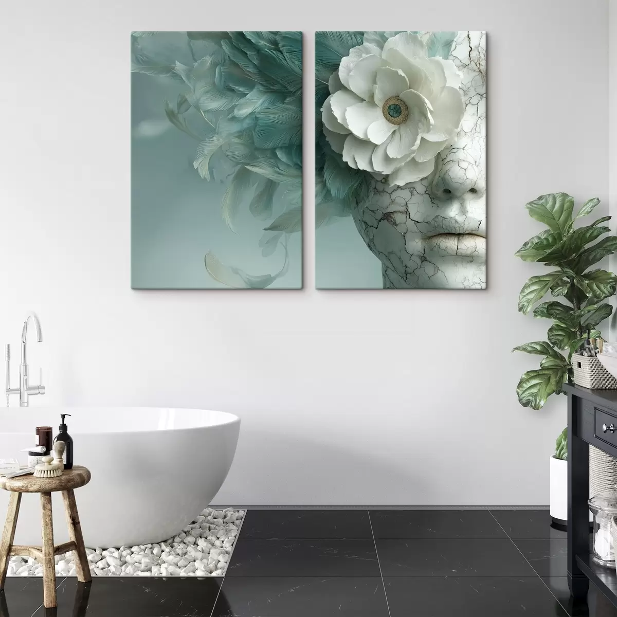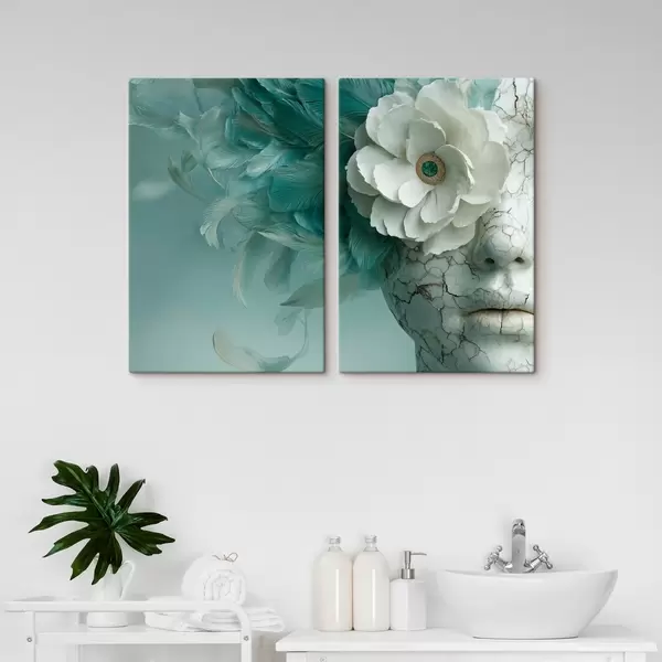 Pictură pe pânză fața de marmură a unei fete cu o floare și pene Nr m00699
