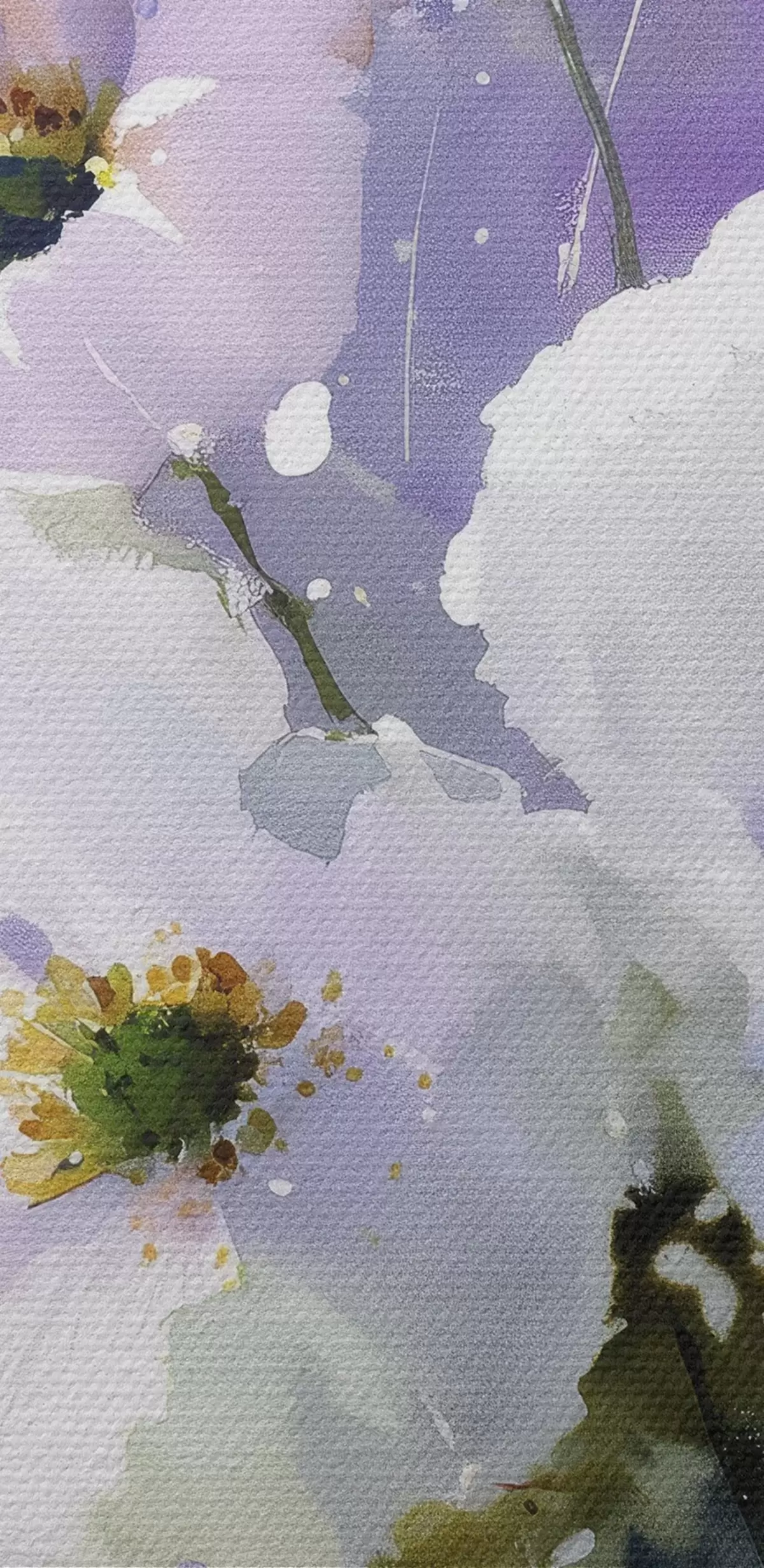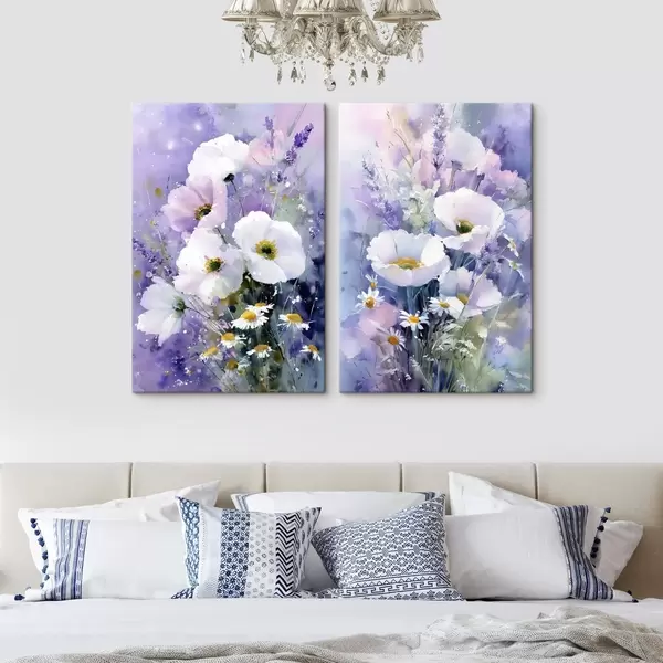Pictură pe pânză buchet în acuarelă în tonuri de liliac și alb Nr m00704