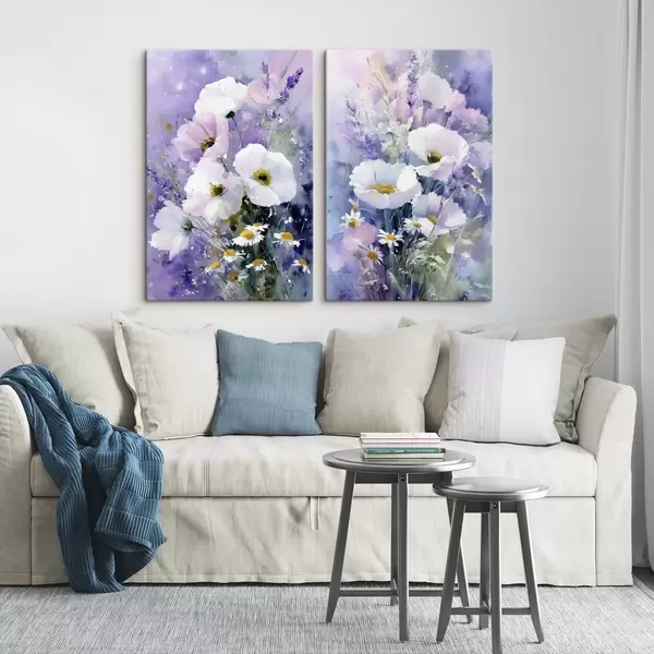 Pictură pe pânză buchet în acuarelă în tonuri de liliac și alb Nr m00704