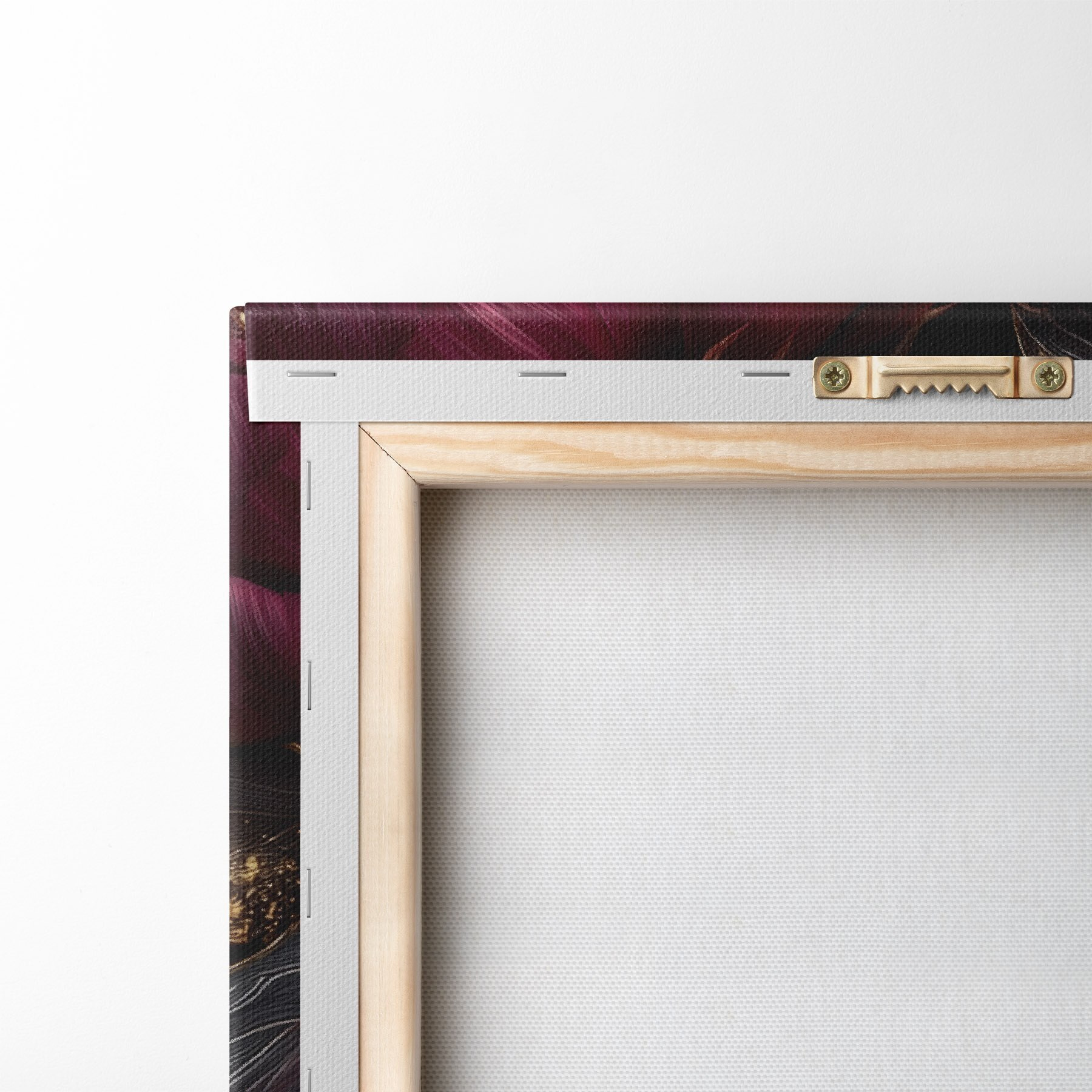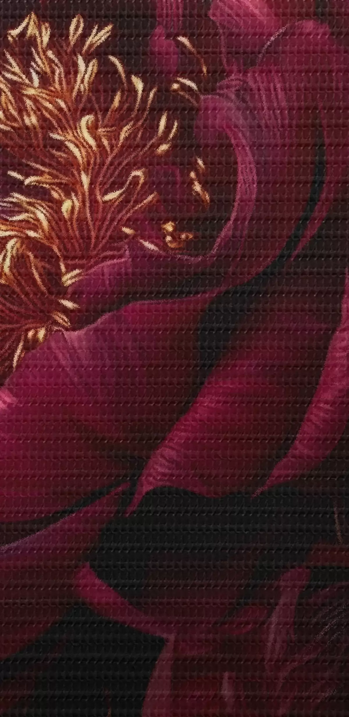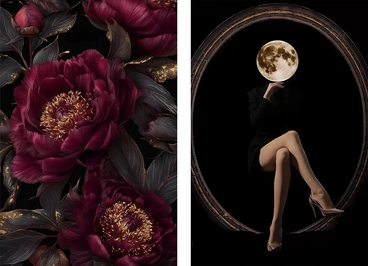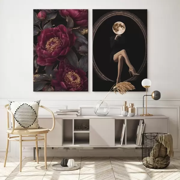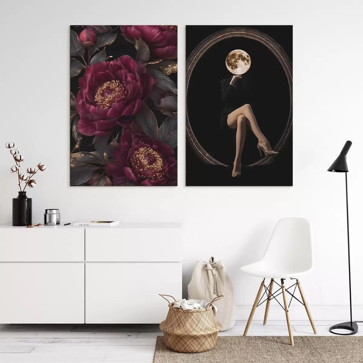 Pictură pe pânză Bujori burgund și o siluetă cu cap de lună pe fond negru Nr m00765