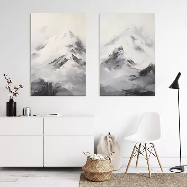 Pictură pe pânză Vârfuri de munte înzăpezite cu umbre cenușii, cer cenușiu, pensule, texturat, minimalist Nr m00822