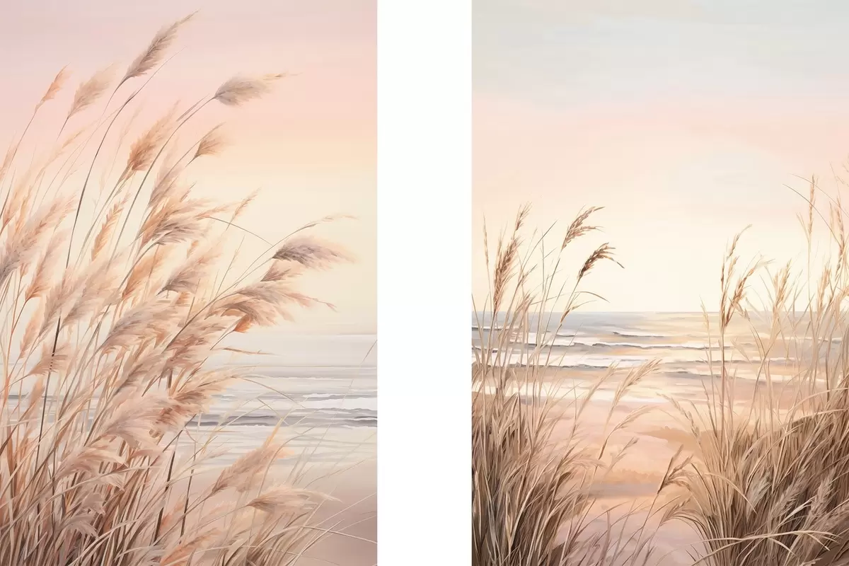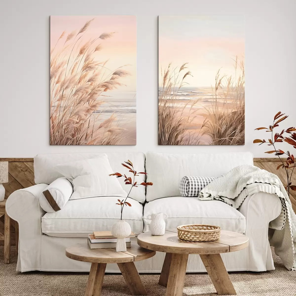 Pictură pe pânză Iarbă de pampas cu paletă de culori portocaliu pastel, cer roz deschis, un peisaj liniștit Nr m00823