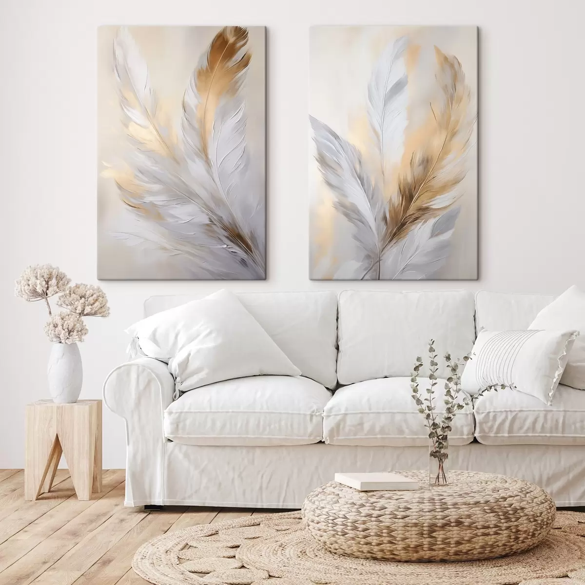 Pictură pe pânză Pene cu accente portocalii, compoziție minimalistă texturată, artă modernă Nr m00828