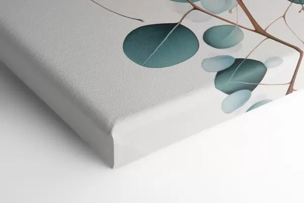 Pictură pe pânză Ramură de eucalipt cu frunze albastre și flori albe, fundal deschis Nr m00829