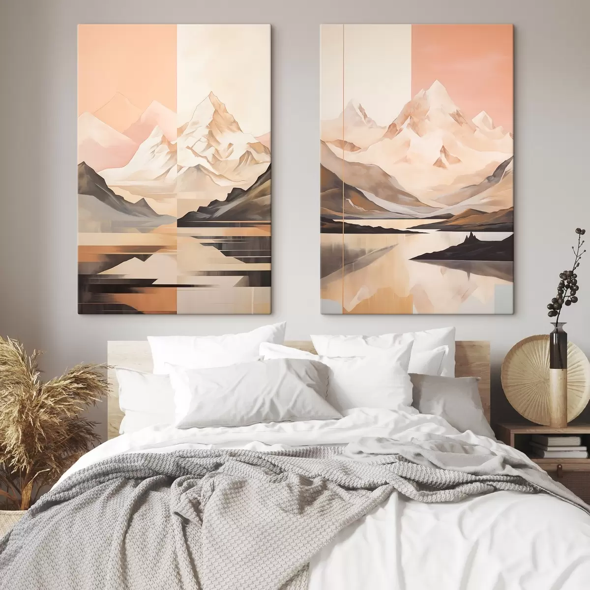 Pictură pe pânză Peisaj abstract cu munți și un lac, culori pastelate, stil minimalist Nr m00830