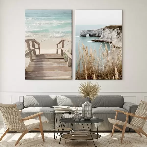 Pictură pe pânză Stânci de coastă și iarbă uscată lângă marea turcoaz Nr m00875