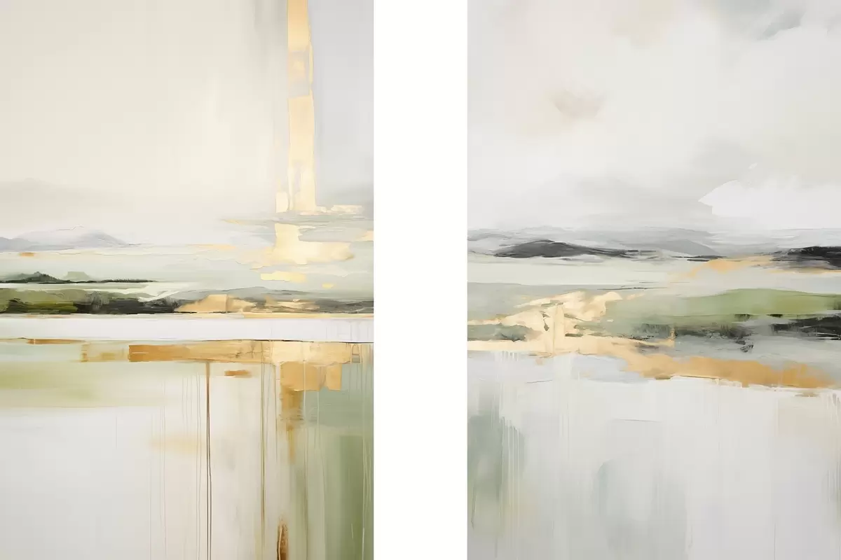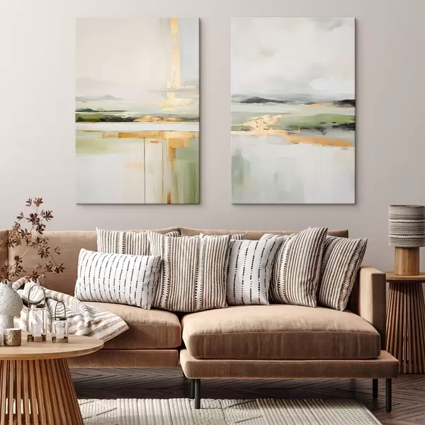 Pictură pe pânză Peisaj abstract cu accente galbene, o compoziție minimalistă de pământ, apă și cer, cu culori discrete Nr m00877
