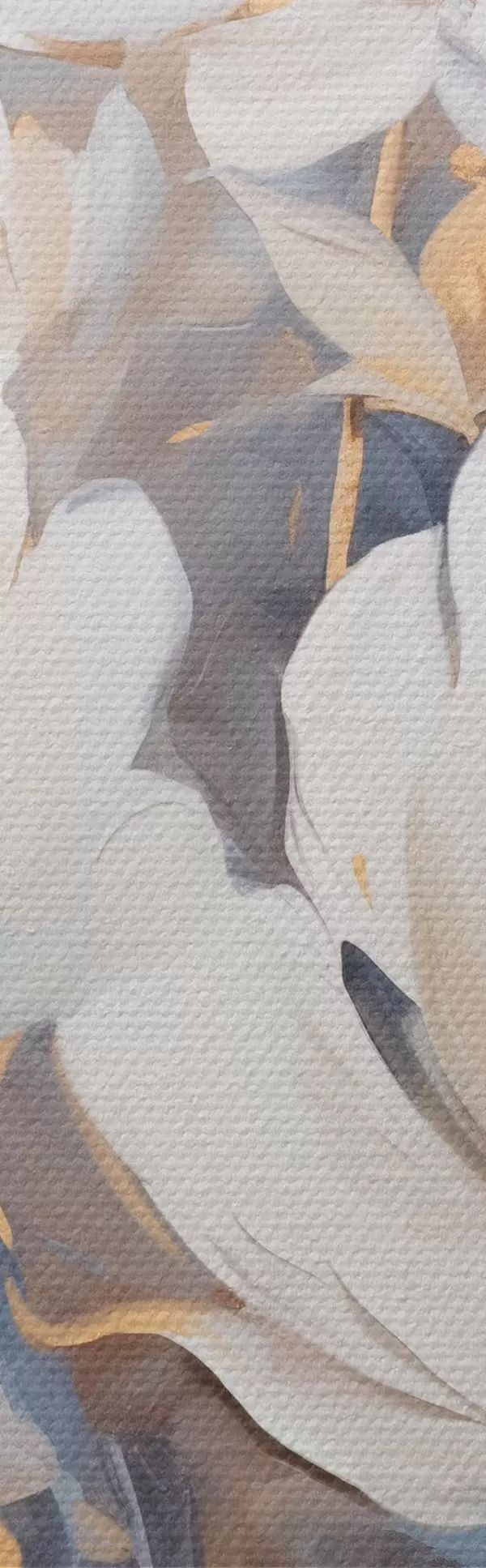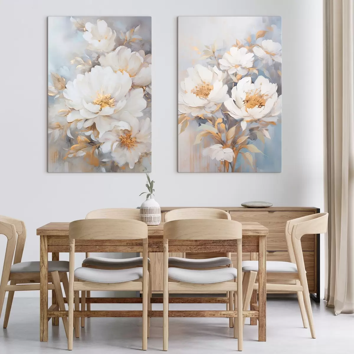 Pictură pe pânză Bujori albi cu mijlocul și frunzele galbene, tușe delicate, fundal albastru deschis, aranjament floral Nr m00878