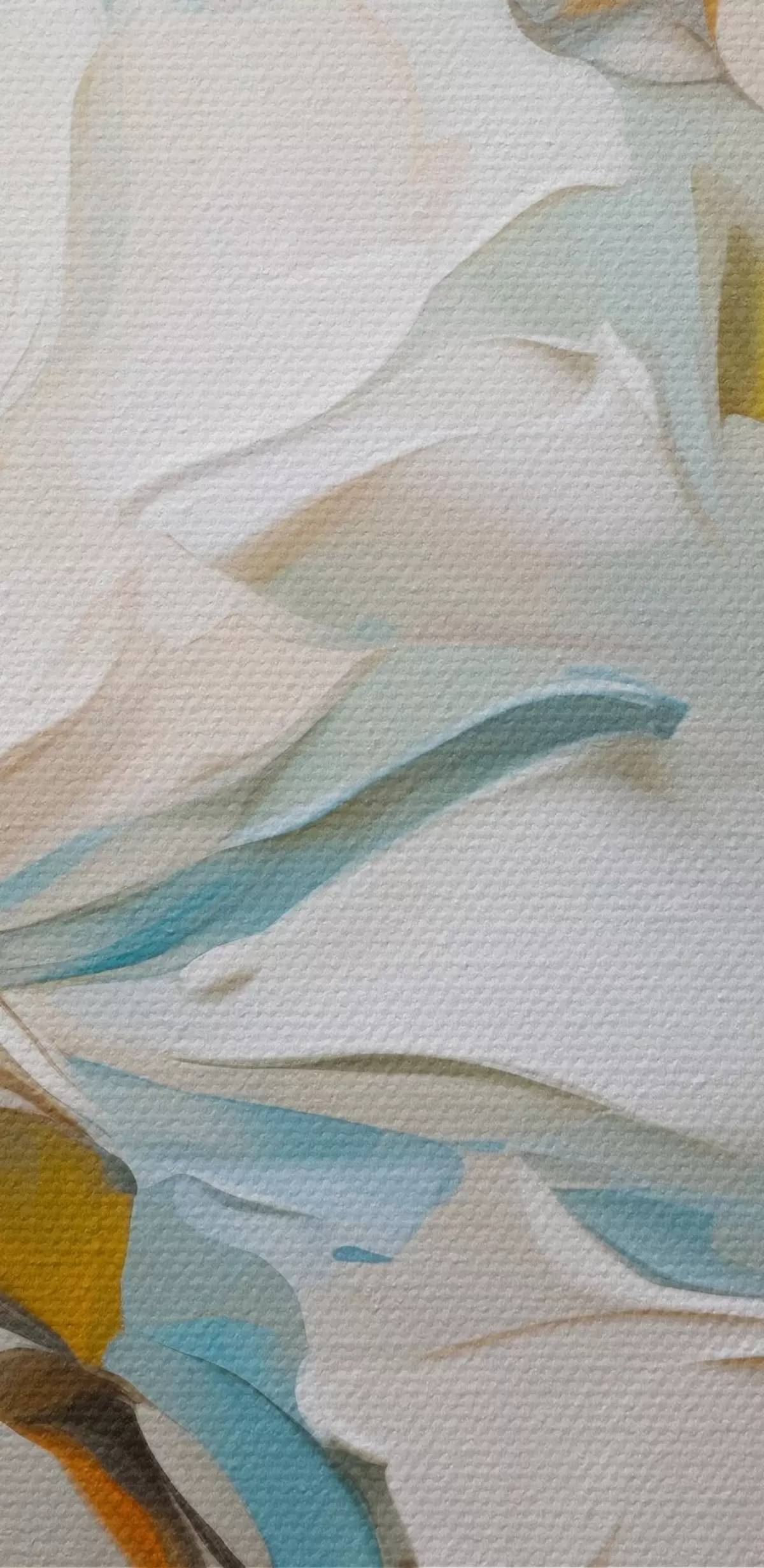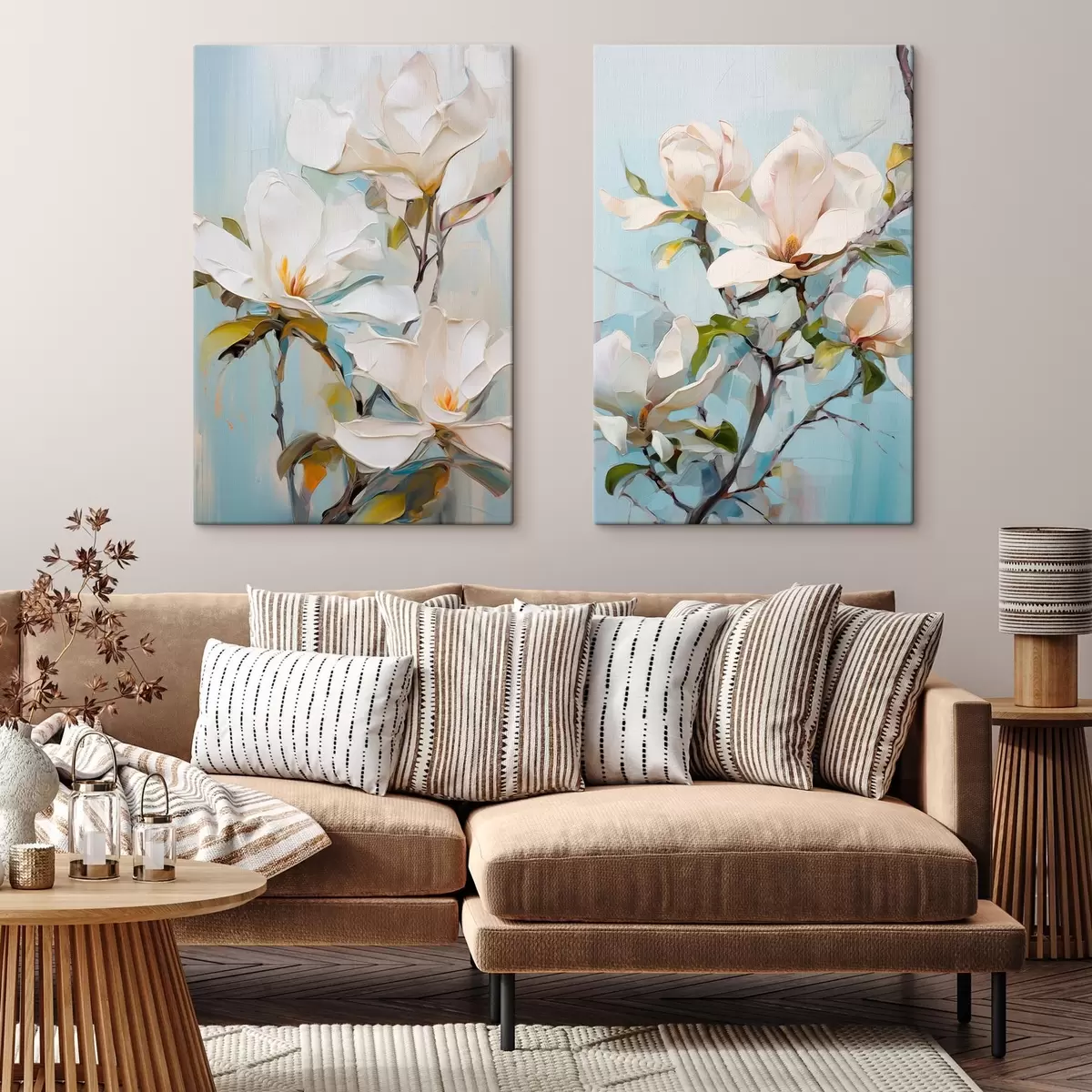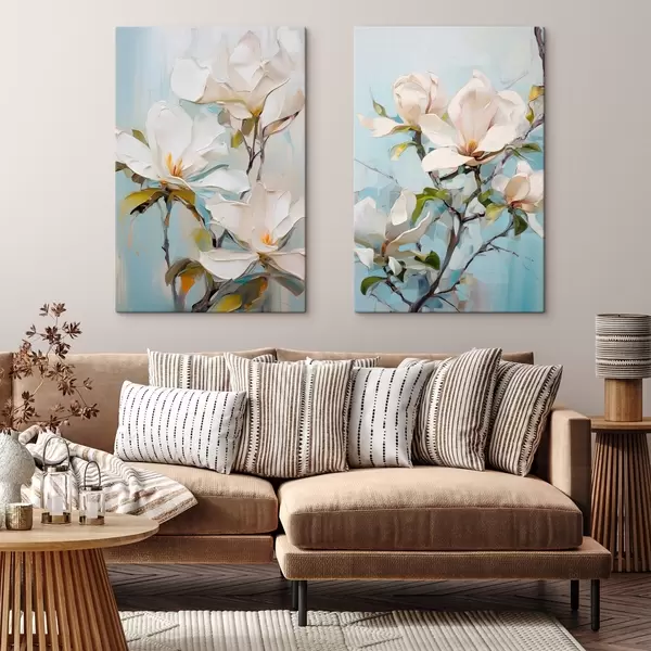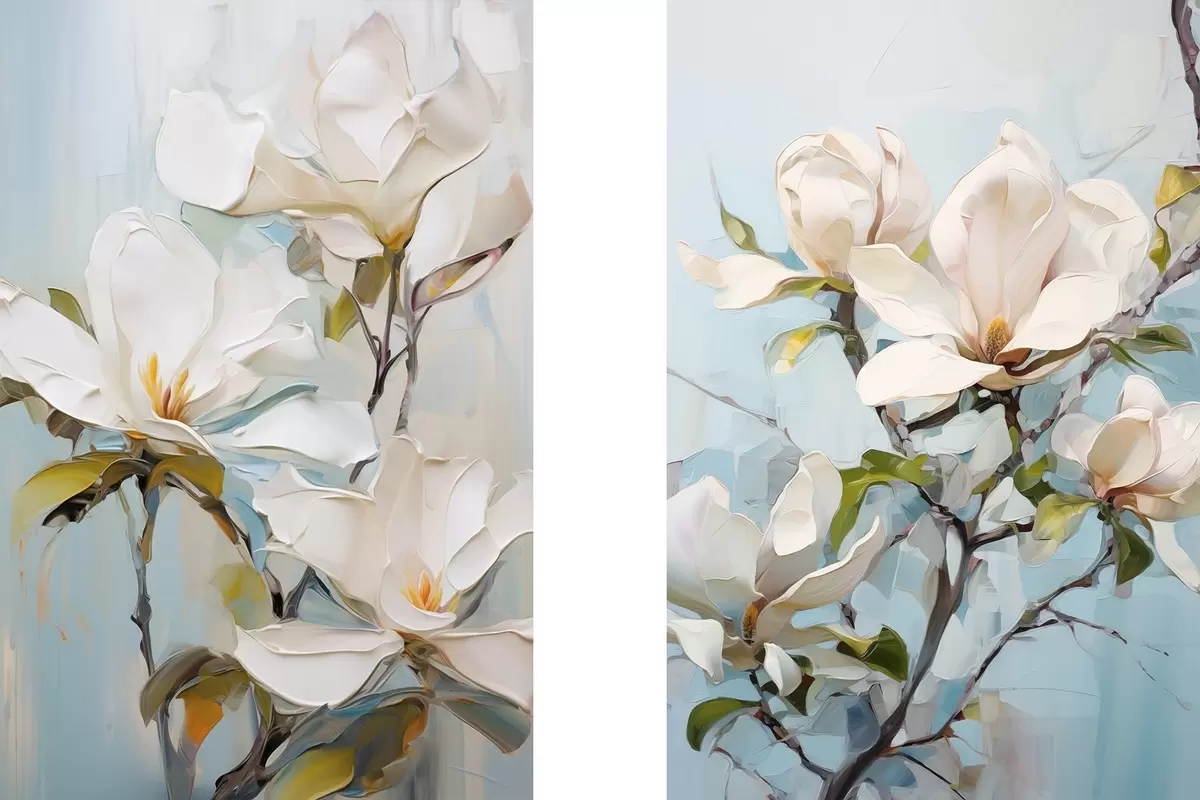 Pictură pe pânză Flori albe de magnolie, fundal albastru deschis cu tușe delicate, stil pictură în ulei, textură impasto Nr m00881