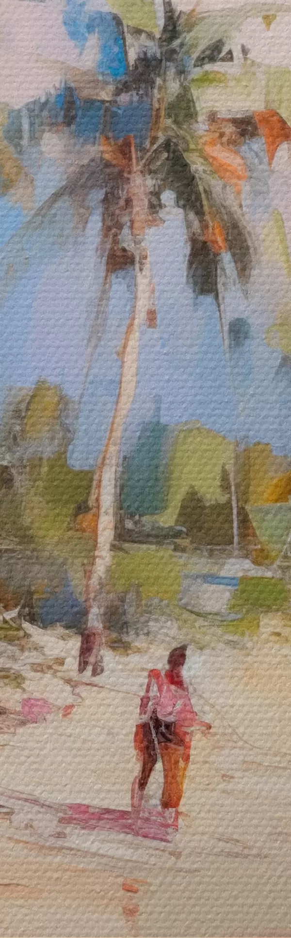 Pictură pe pânză Peisaj abstract, o plajă cu palmieri, o zi însorită cu cer albastru și câteva nori Nr m00885