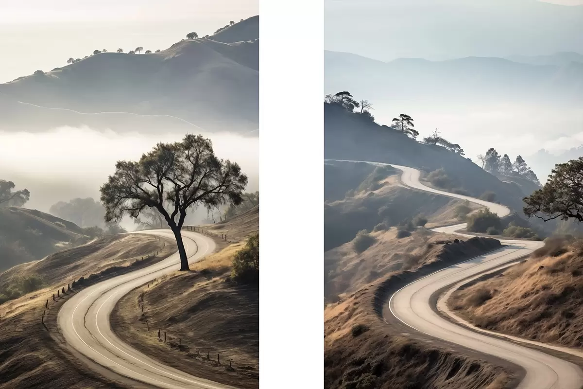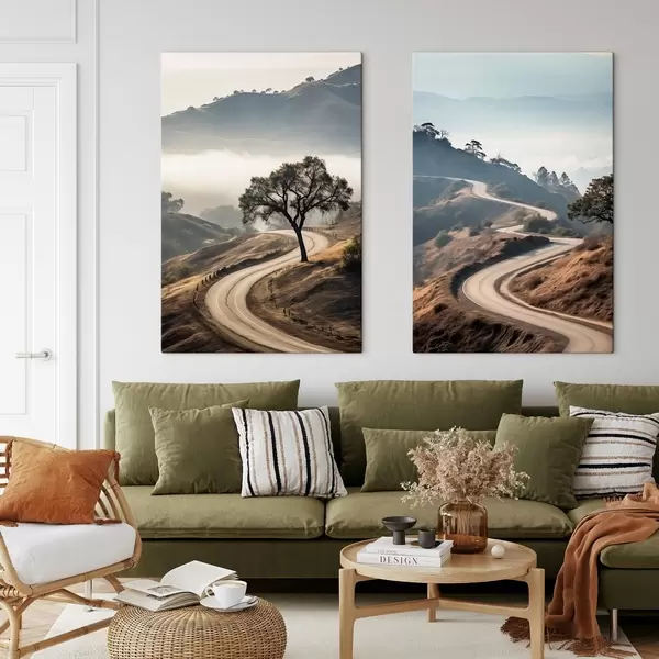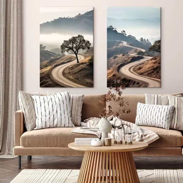 Pictură pe pânză Un drum sinuos prin peisajul deluros, cu iarbă uscată, sub un cer senin, cu munți în depărtare Nr m00887