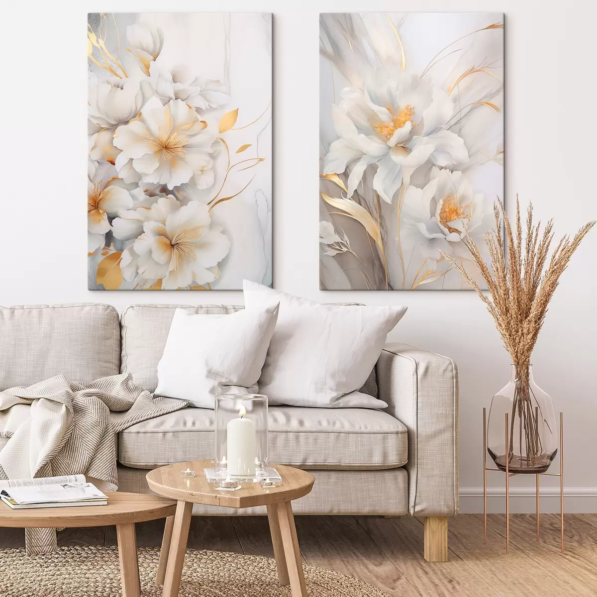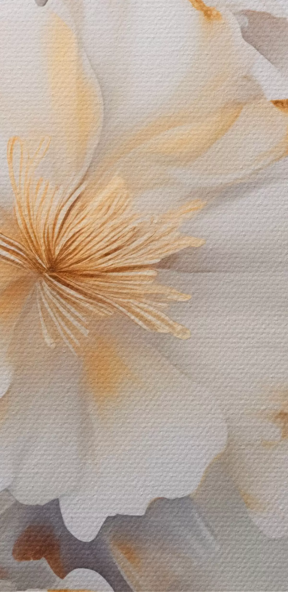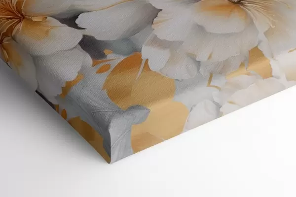 Pictură pe pânză Flori albe cu detalii galbene, petale cu umbre subtile, fundal deschis cu efect marmorat subtil Nr m00889