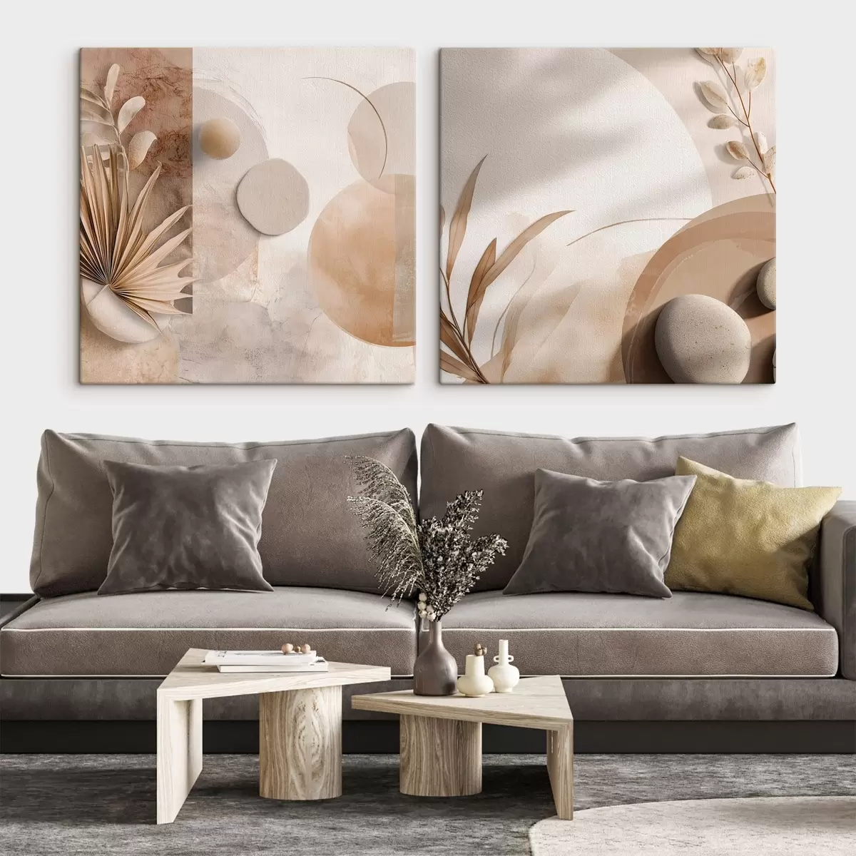 Pictură pe pânză Două pânze cu frunze uscate și forme texturate Nr m00893