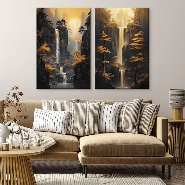 Pictură pe pânză Peisaj cu cascadă și munți în lumină aurie Nr m00928