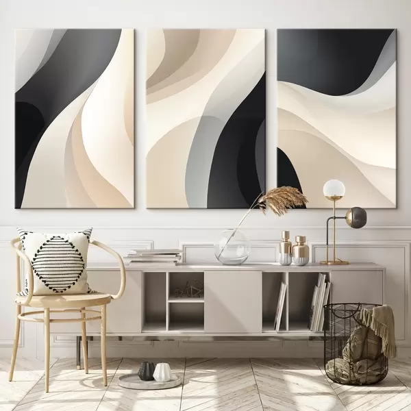 Pictură pe pânză Curbe fluide minimaliste în culori crem, gri-maro și negru Nr m00962