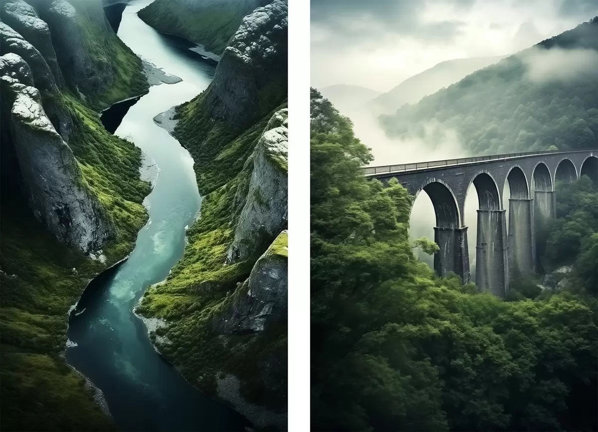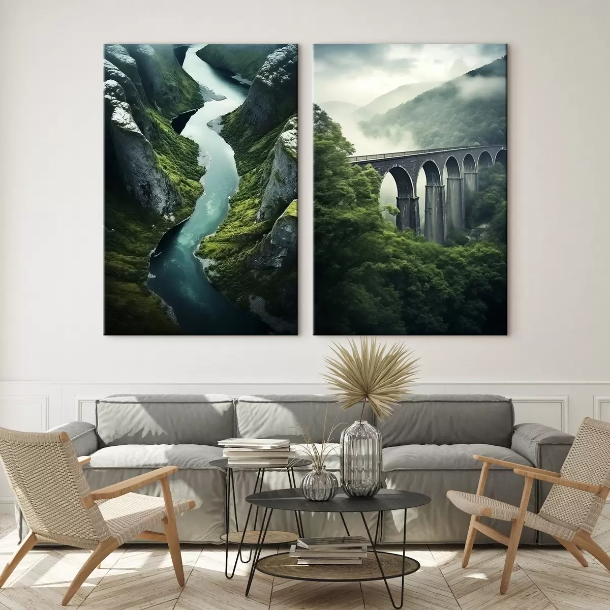 Pictură pe pânză Canionul râului aerian și viaductul învăluit în ceață, înconjurat de dealuri verzi Nr m00967