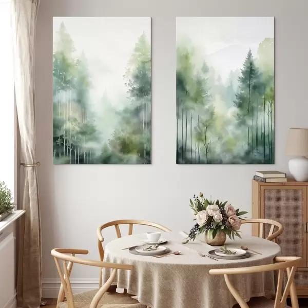 Pictură pe pânză Imitatie de pictura in acuarela reprezentand o padure abstracta cu copaci inalti si frunziș verde, culori delicate si discrete Nr m01005