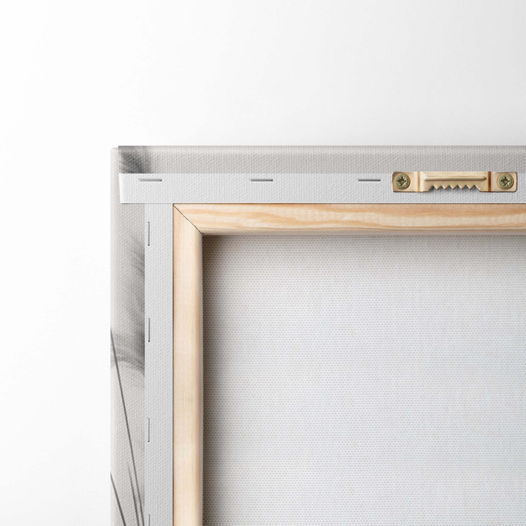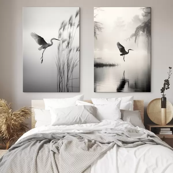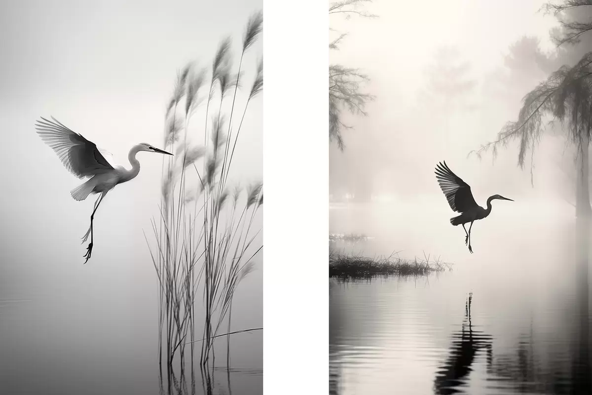 Pictură pe pânză O stârcă albă cu aripile întinse, zburând lângă stufărișuri înalte, compoziție minimalistă în alb și negru Nr m01007
