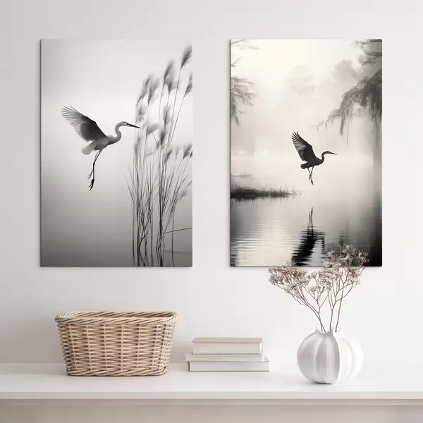 Pictură pe pânză O stârcă albă cu aripile întinse, zburând lângă stufărișuri înalte, compoziție minimalistă în alb și negru Nr m01007
