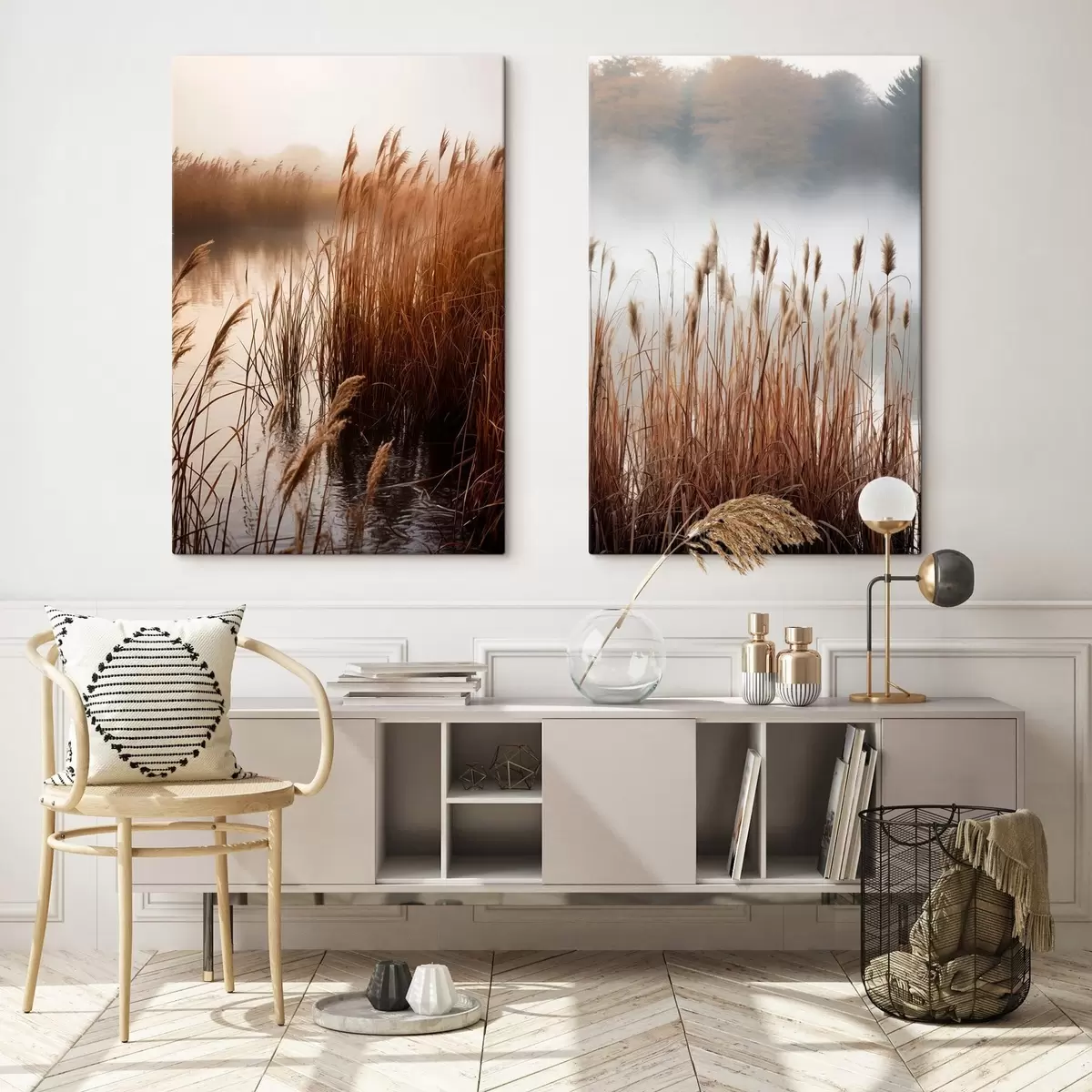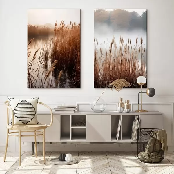 Pictură pe pânză Stuf înalt crescând într-un corp de apă, apa reflectă stuful, fundal cețos, lumină difuză, peisaj natural Nr m01008