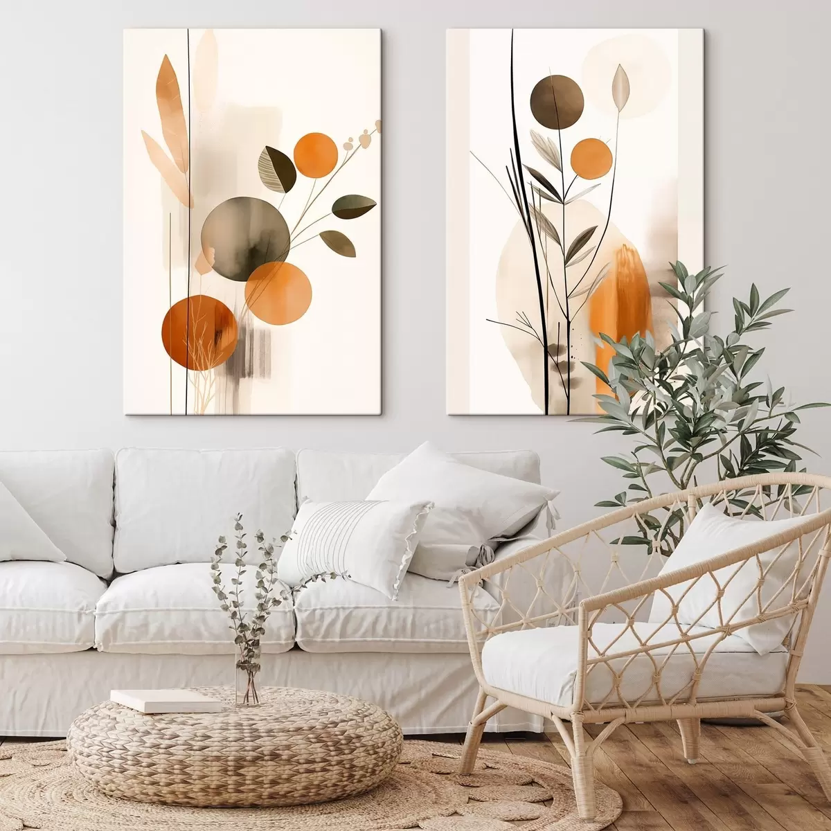 Pictură pe pânză Imitare de pictură abstractă cu cercuri portocalii și gri, frunze și ramuri, stil modern, efect de acuarelă Nr m01009